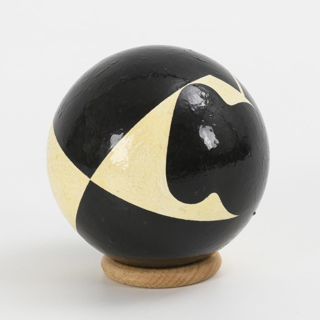 Die kontrastreiche Bemalung verschmilzt streng geometrische und organische Formen, was durch die Kugelkrümmung verstärkt wird. Lack leicht vergilbt, Standring ergänzt.