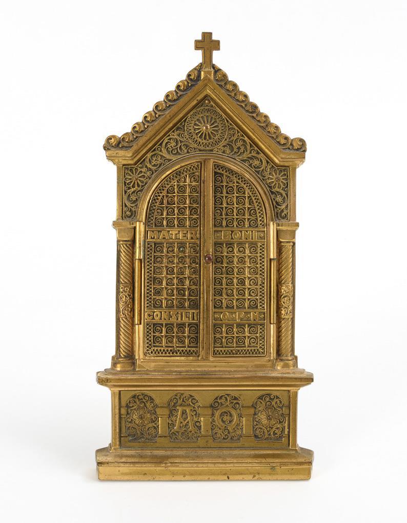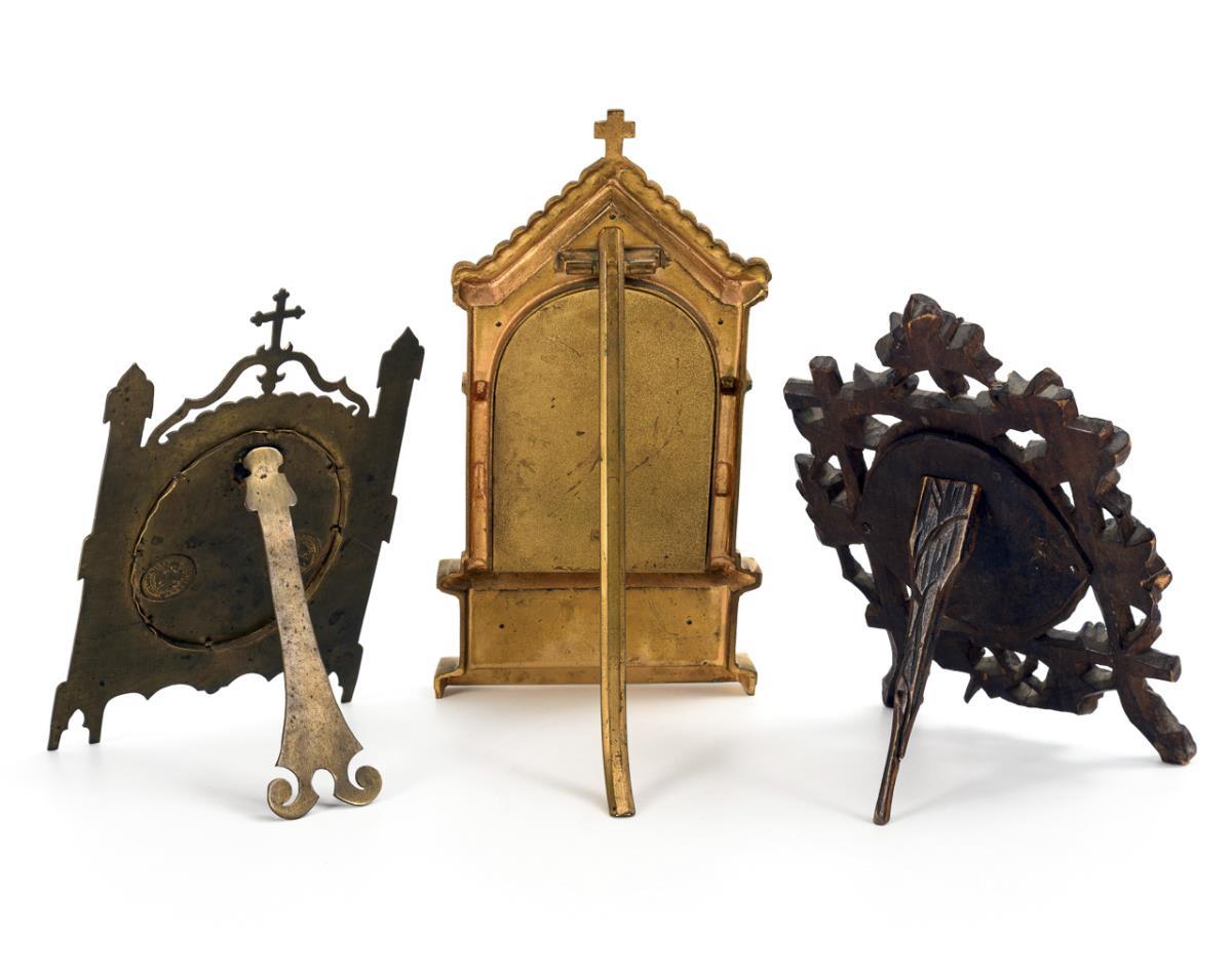 Erhard & Söhne gemarkter Messing-Hausaltar mit Aufsteller, hinter den Flügeltüren Porzellanplakette Mater dolorosa nach Carlo Dolci. / Gleiche Darstellung, teils goldstaffiert, im gepunzten Messingrahmen mit Aufsteller (Fr. Theyer Wien gemarkt). / Geschnitzter Holzrahmen mit Aufsteller und Porzellanplakette Madonna della Sedia. Kleine Fehlstellen und Bestoßungen am Holz, 1 Plakette mit Kratzspur, 1 Vergoldung berieben.