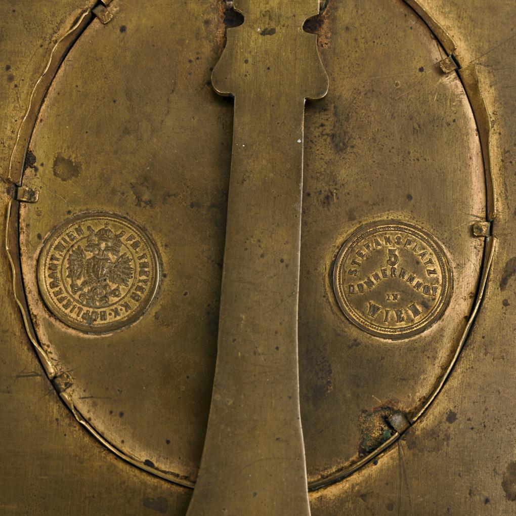 Je Emailmalerei über Umrissvordruck, Messing mit Filigran-Imitat bzw. gepunzt, dunkel gebeiztes Nadelholz. Plaketten maximal 9 x 5,5 cm, Rahmen maximal 22 x 11 cm.