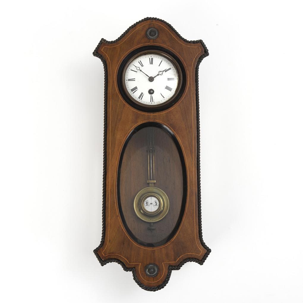 Wanduhr mit geschweiftem und seitlich verglastem Gehäuse, Fronttür mit Perlrand sowie rundem, gewölbtem Zifferglas und ovalem Pendelglas. Leichte Altersspuren, kleine Holzdefekte, Zifferblatt leicht haarrissig.