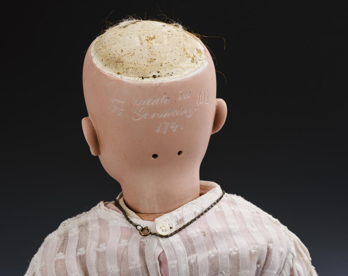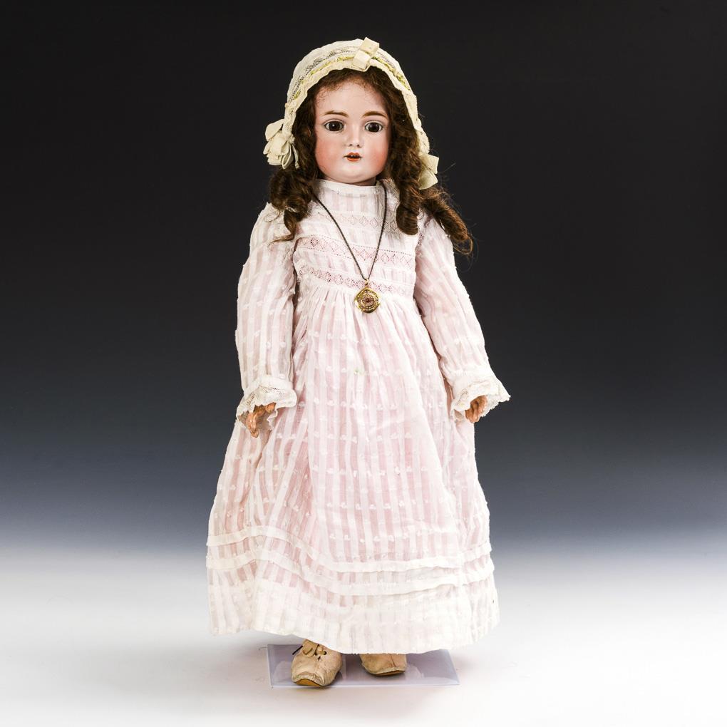 Kurbelkopf mit fest vergipstem Kopfdeckel, braune Schlafaugen, braune Lockenperücke. 15-teiliger Gliederkörper. Weißes Kleid, rosa Unterkleid, Haube mit Weißstickerei, weiße Lederschuhe. Kopf nicht durchleuchtet: keine Defekte sichtbar. Füße etwas bestoßen.