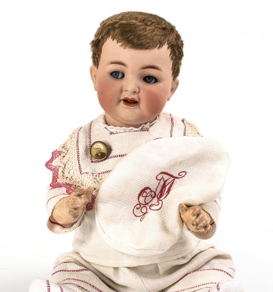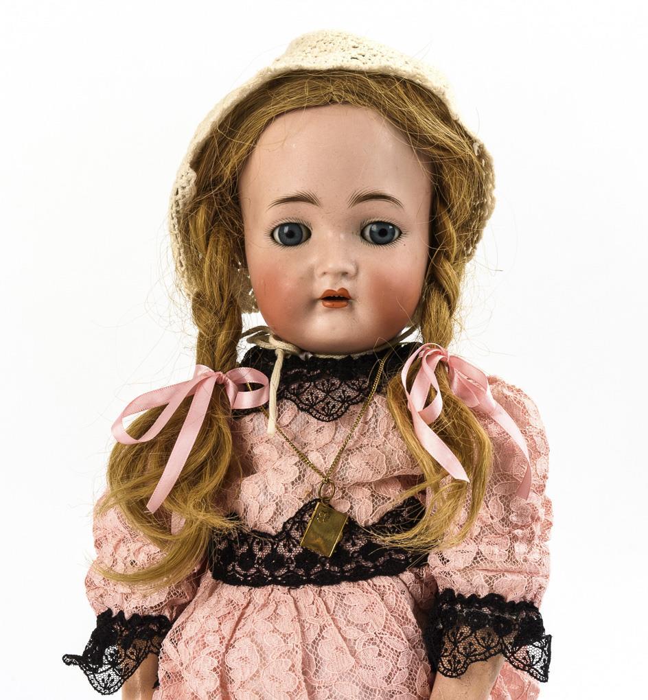 Blondes Porzellankopfmädchen (403): Kurbelkopf, blaue Schlafaugen, Echthaarperücke mit Zöpfen, 15-teiliger Gliederkörper, rosa Kleid, Häkelhaube und schwarze Schuhe, L 52 cm. Minimaler Perückenpull, 1 Arm mit Farbabrieb, übermalte Hände mit Defekten. / Charakterbaby (126): Kurbelkopf, blaue Schlaf-/Schelmenaugen, dunkelblonde Fellperücke aus Mohair, 5-teiliger Sitzbabykörper mit verstummter Stimme, weißer Anzug mit roten Stickereien, passende Mütze, L 52 cm. Kopf nicht durchleuchtet: keine Defekte sichtbar, Augen etwas tief liegend.
