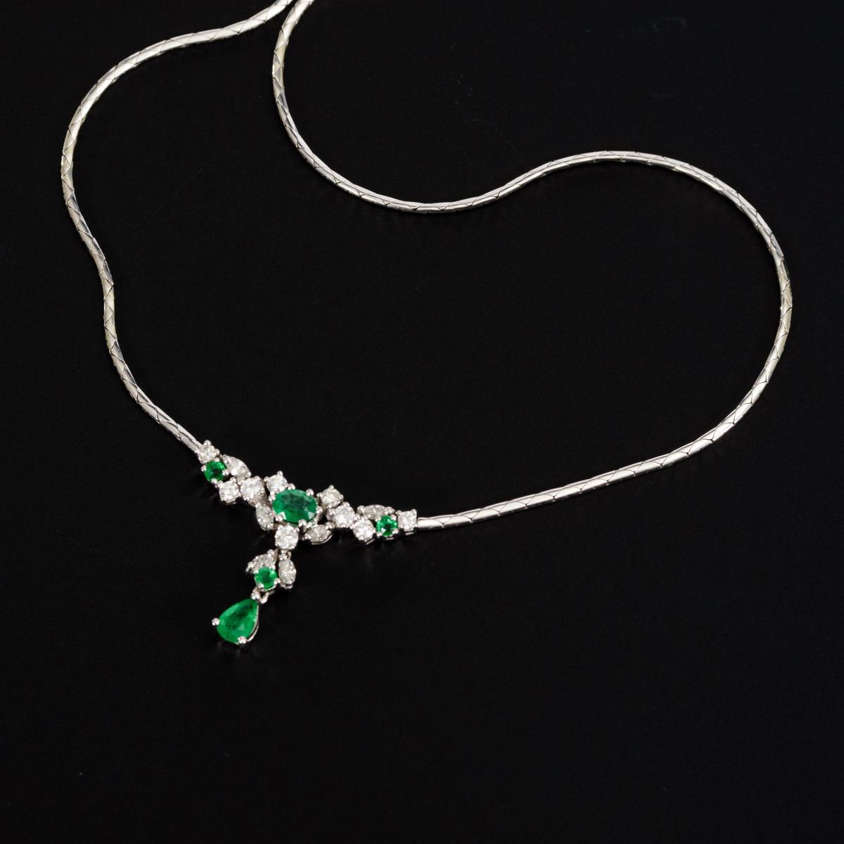 Weißgold 585 gestempelt. Smaragde zus. ca. 0,75 ct. Brillanten zus. ca. 0,42 ct. Diamant-Navetten zus. ca. 0,34 ct/G-H/vs-si. Kettenlänge 42,0 cm. 8,15 g.