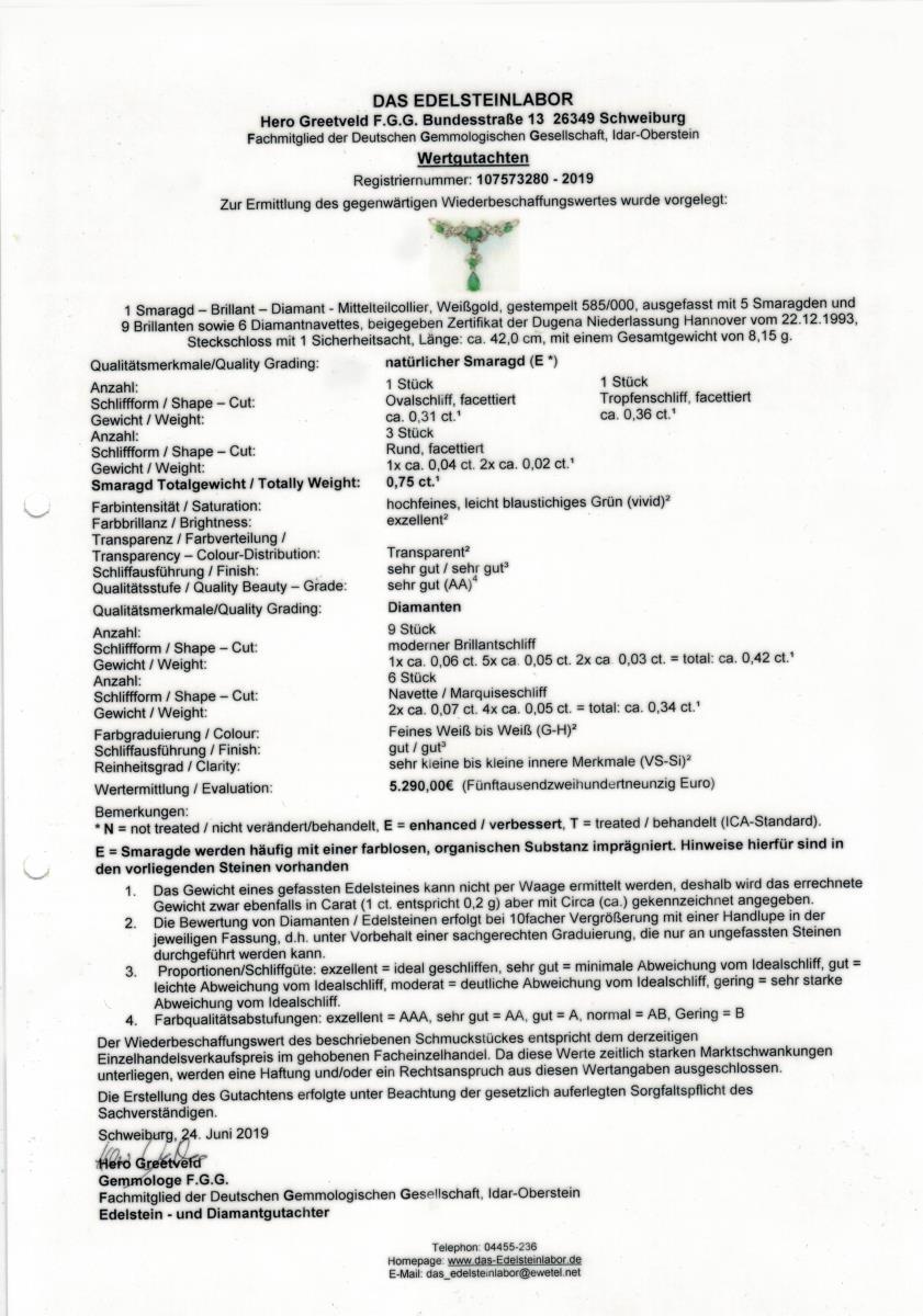 Schauteil besetzt mit 5 Smaragden, 9 Brillanten und 6 Diamant-Navetten. Zierkette mit