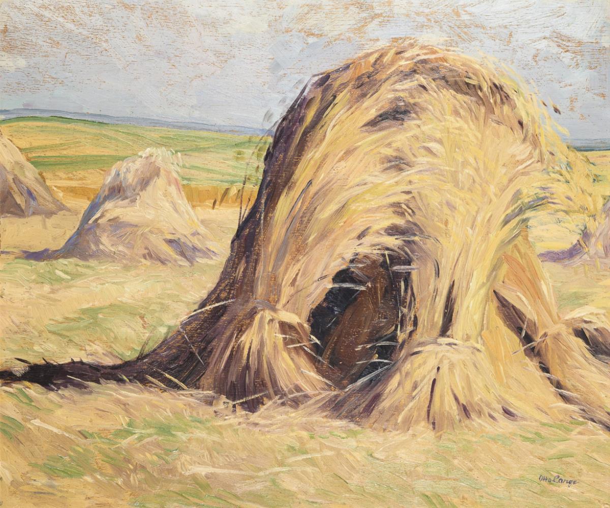 Heugarben, im hellen Sonnenschein in weiter Felderlandschaft | Nachtrag 17.2.24: Otto Lange (1878 Sömmerda - 1956 Nordhausen), Deutscher Maler und Lehrer. Farbabsplitterungen.