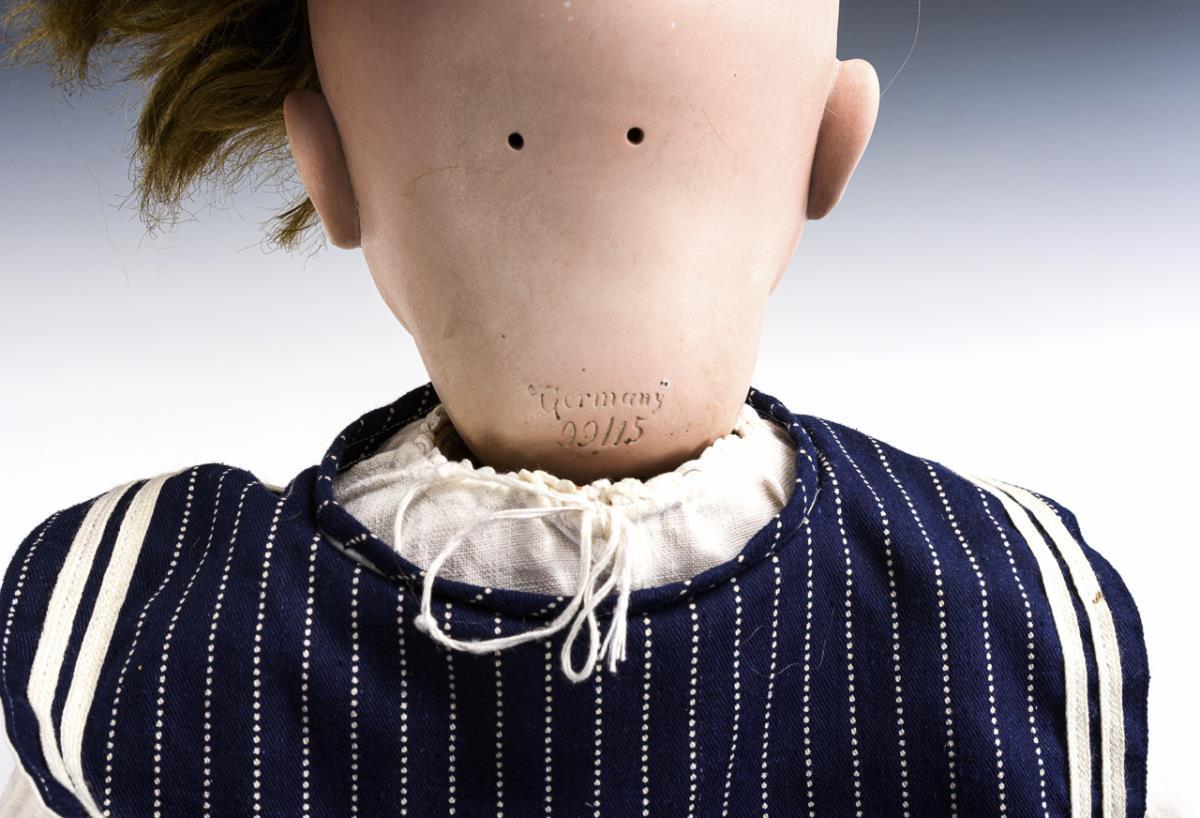 Kurbelkopf, braune Schlafaugen, Wimpern, blonde Echthaarperücke. 5-teiliger Sitzbabykörper. Weißer Anzug mit dunkelblauem Kragen, passende Mütze. Kopf durchleuchtet: ohne Defekte. Hände übermalt.