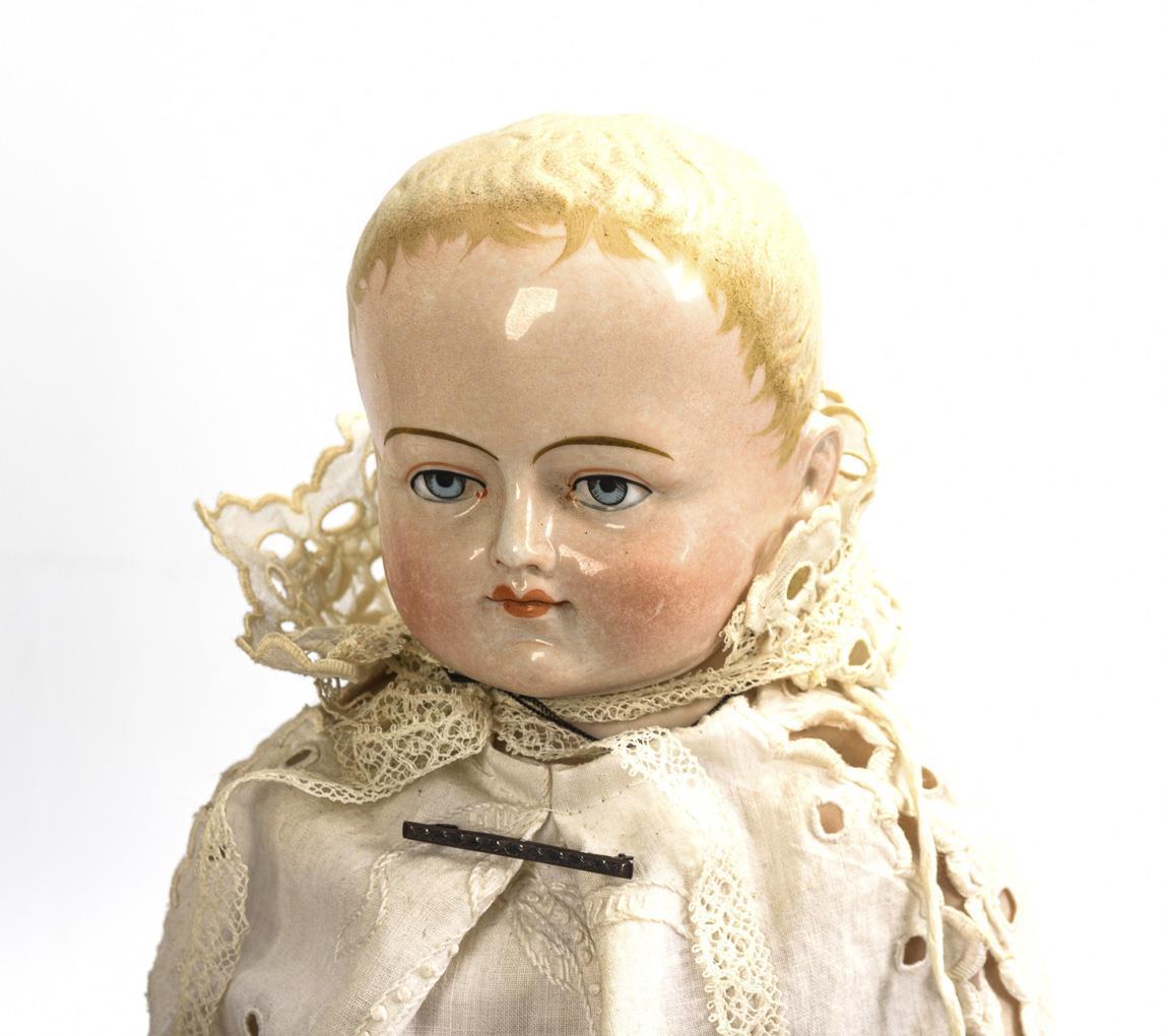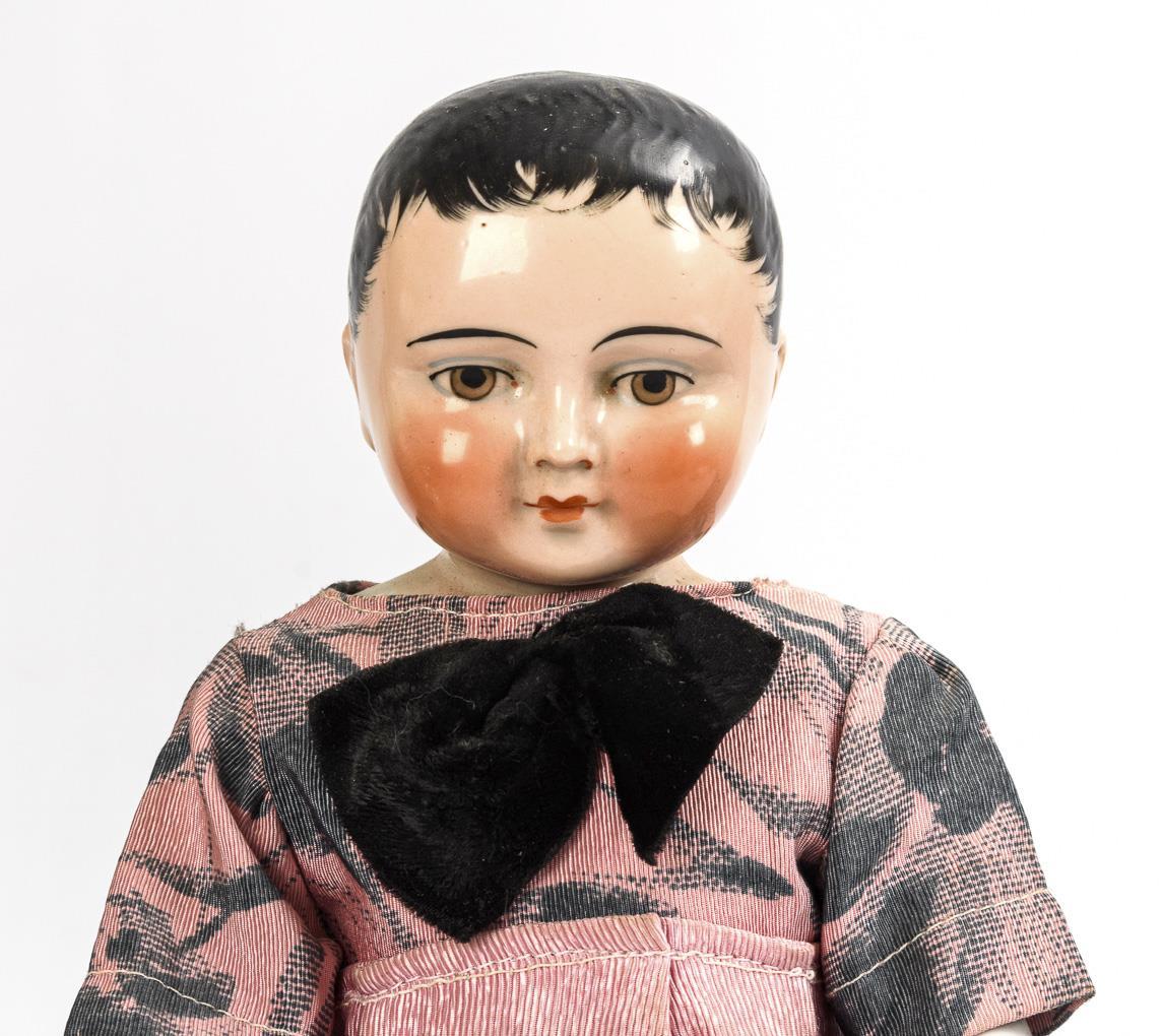 3 Nacktfrösche bzw. sogenannte "Frozen Charlottes", 1x blond, 2x mit schwarzen Haaren. Alle bekleidet, mit Stehhilfe. Keine Defekte sichtbar.
