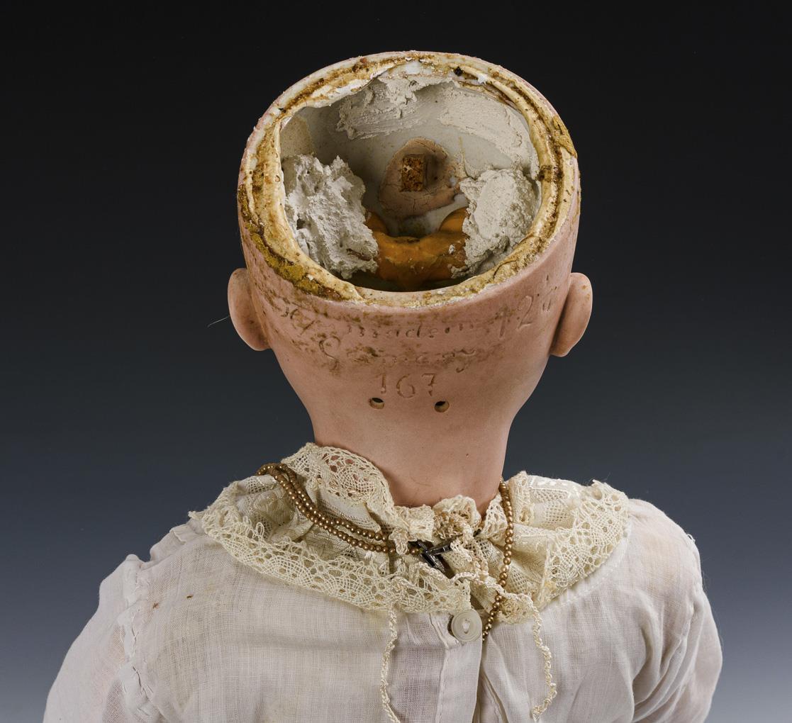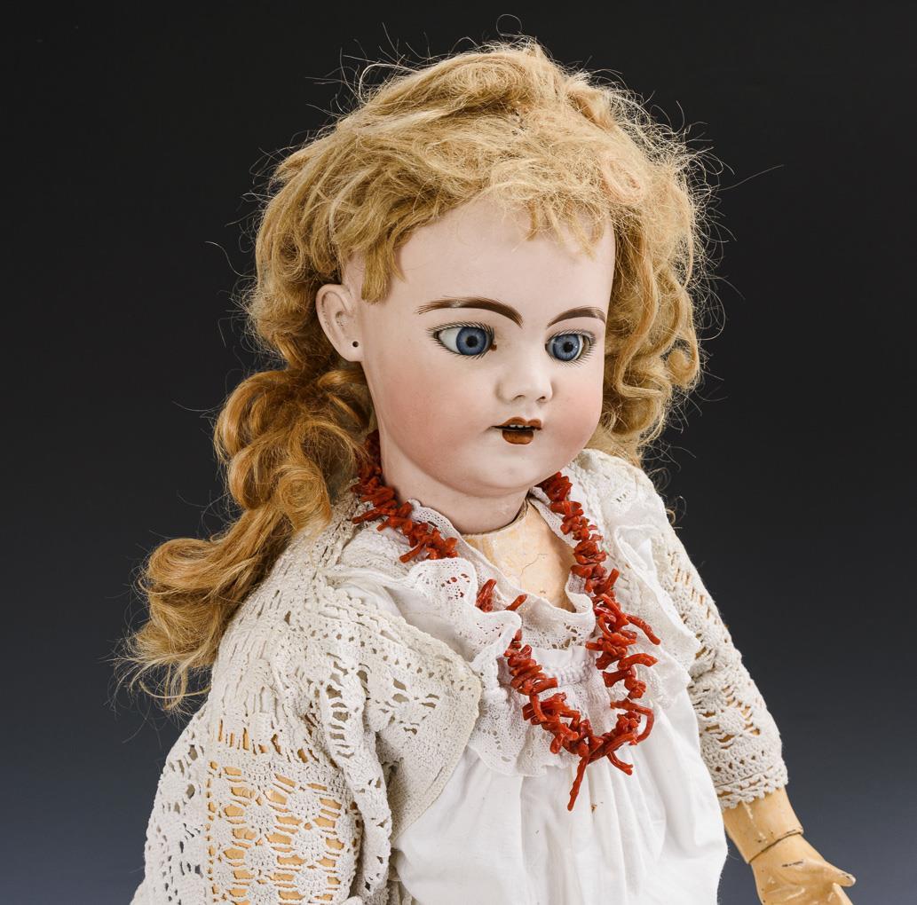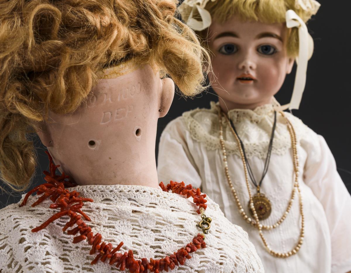 Beide mit Kurbelkopf, blauen Augen, blonder Perücke, mehrteiligem Gliederkörper und weißem Kleid. Kestner-Mädchen mit festgegipsten Schlafaugen und leicht spröden Gummi?-Händen. S & H-Puppe mit defekter Mechanik im Körper, 1 Finger geklebt. Köpfe durchleuchtet: ohne Defekte.