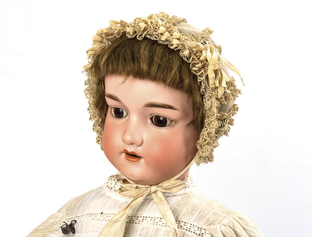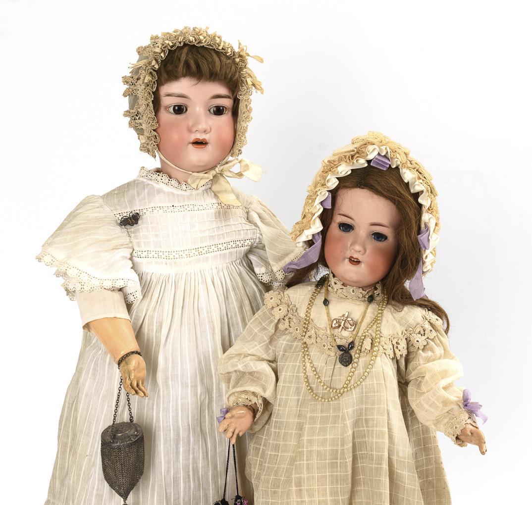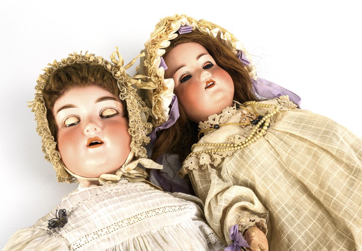 Beide mit Kurbelkopf, Schlafaugen, hellbrauner Perücke, mehrteiligem Gliederkörper, hellem Kleid, Haube und weißen Schuhen. Köpfe durchleuchtet: ohne Defekte (1x Zähne bestoßen). Beide mit Farbdefekten bzw. Übermalungen (1x Hand mit Reparatur und fehlendem Finger).
