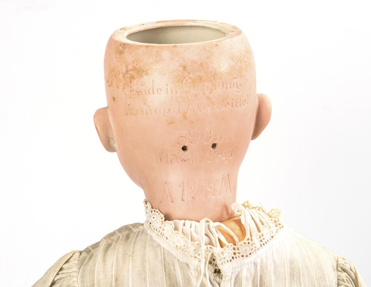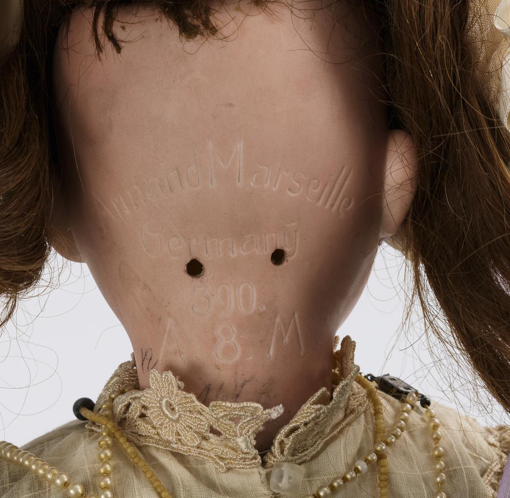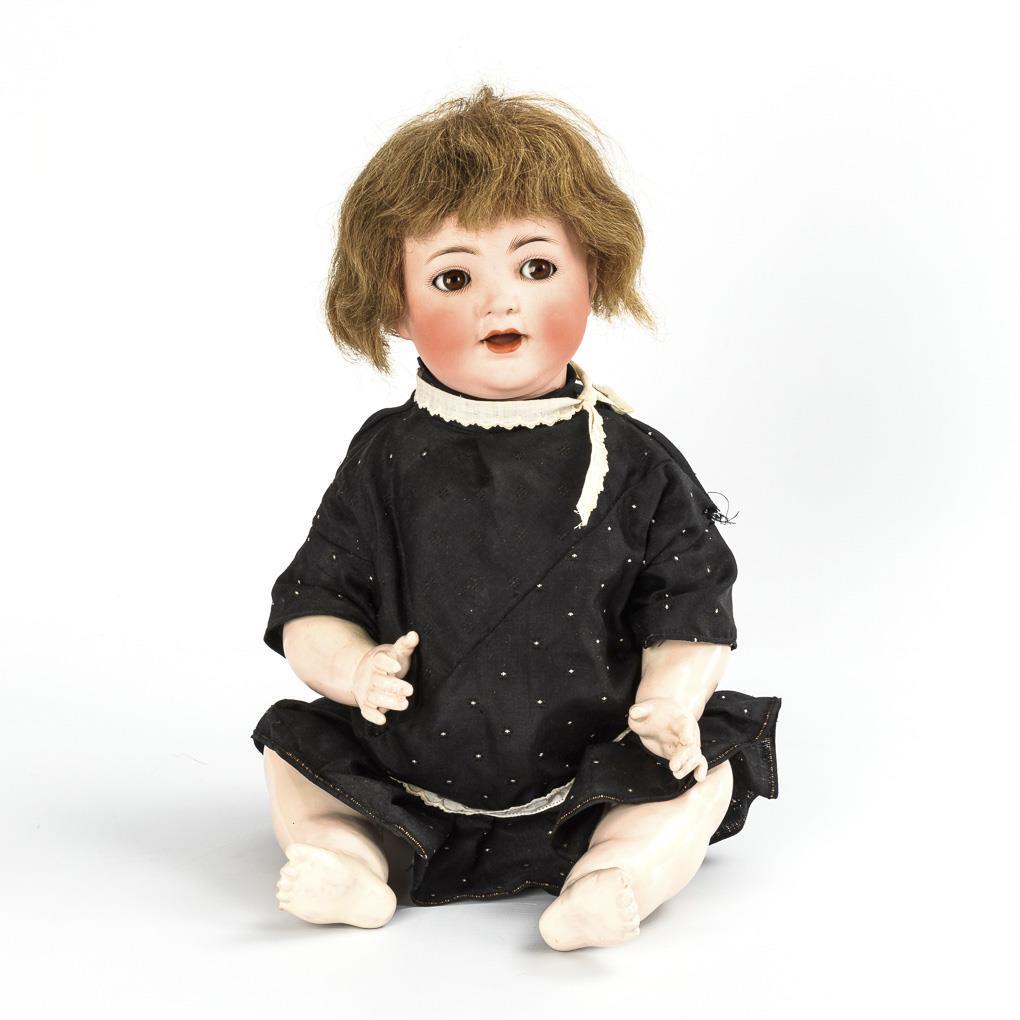 Beide mit Kurbelkopf, Schlafaugen, hellbrauner Perücke, mehrteiligem Gliederkörper, hellem Kleid, Haube und weißen Schuhen. Köpfe durchleuchtet: ohne Defekte (1x Zähne bestoßen). Beide mit Farbdefekten bzw. Übermalungen (1x Hand mit Reparatur und fehlendem Finger).