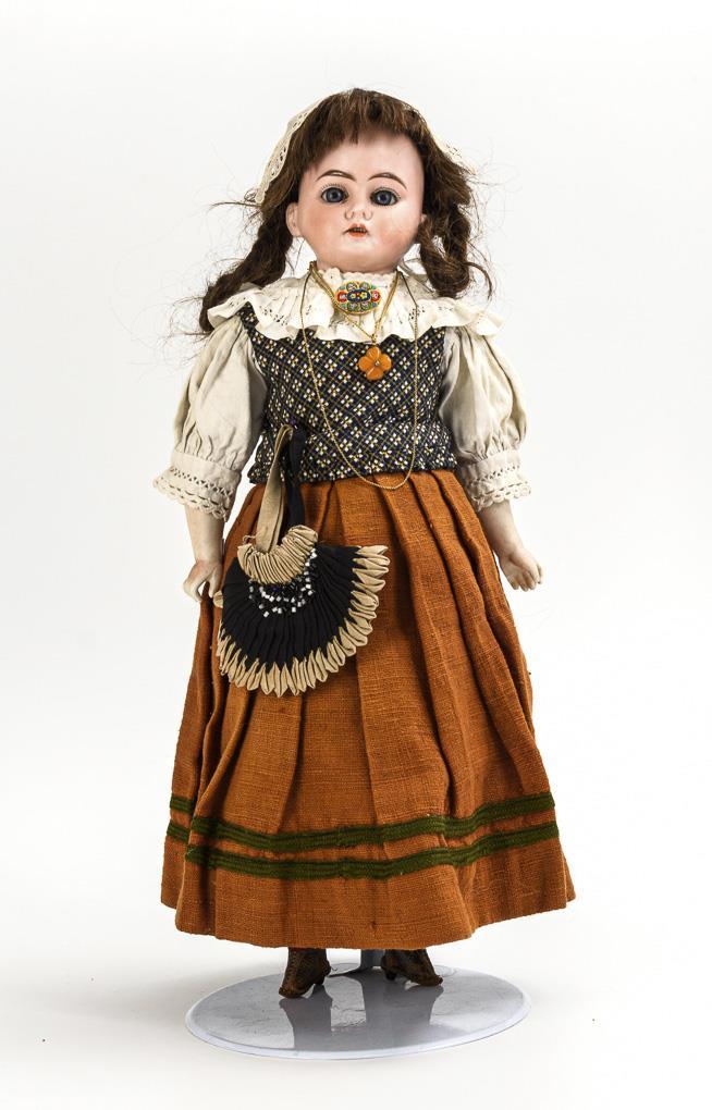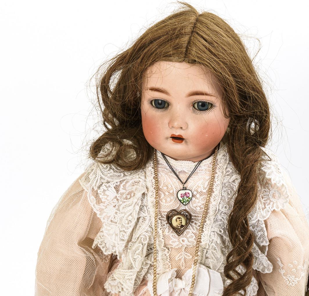 Beide mit Brustkopf, blauen Schlafaugen, Echthaarperücke und Biskuitunterarmen. 1x mit Stoffkörper, originalen, angenähten Absatzstiefelchen und braunem Rock, L 46 cm. 1x mit Lederkörper, Po-, Knie- und Ellbogenzwickeln, langem weißen Kleid und Perlenkette, L 66 cm. Kopf der kleineren Puppe mit überklebter Bruchstelle am Hals vorn. Kopf der größeren Puppe ohne Defekte, Körper mit Reparaturen, 1 Finger mit kleinem Chip.