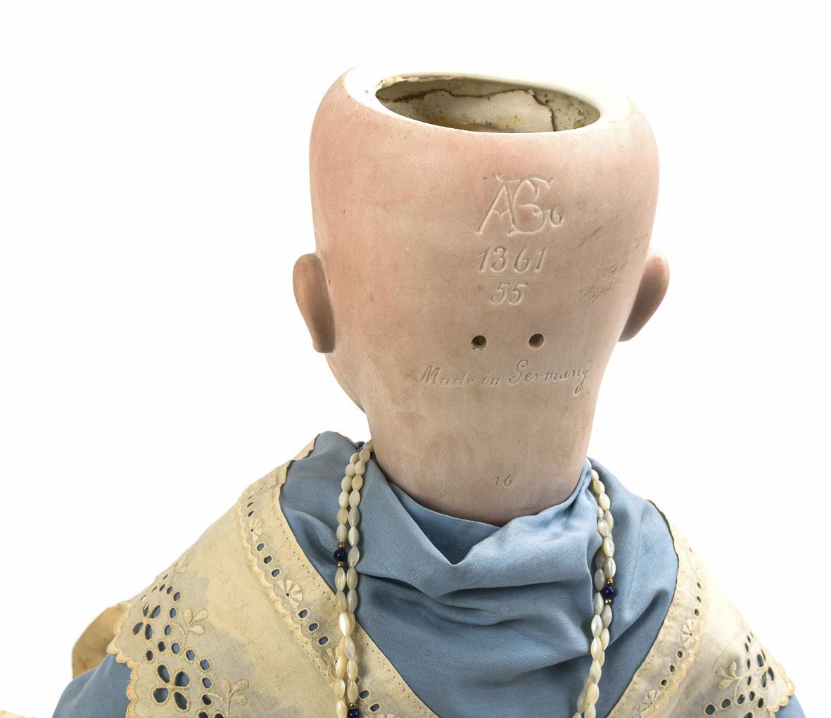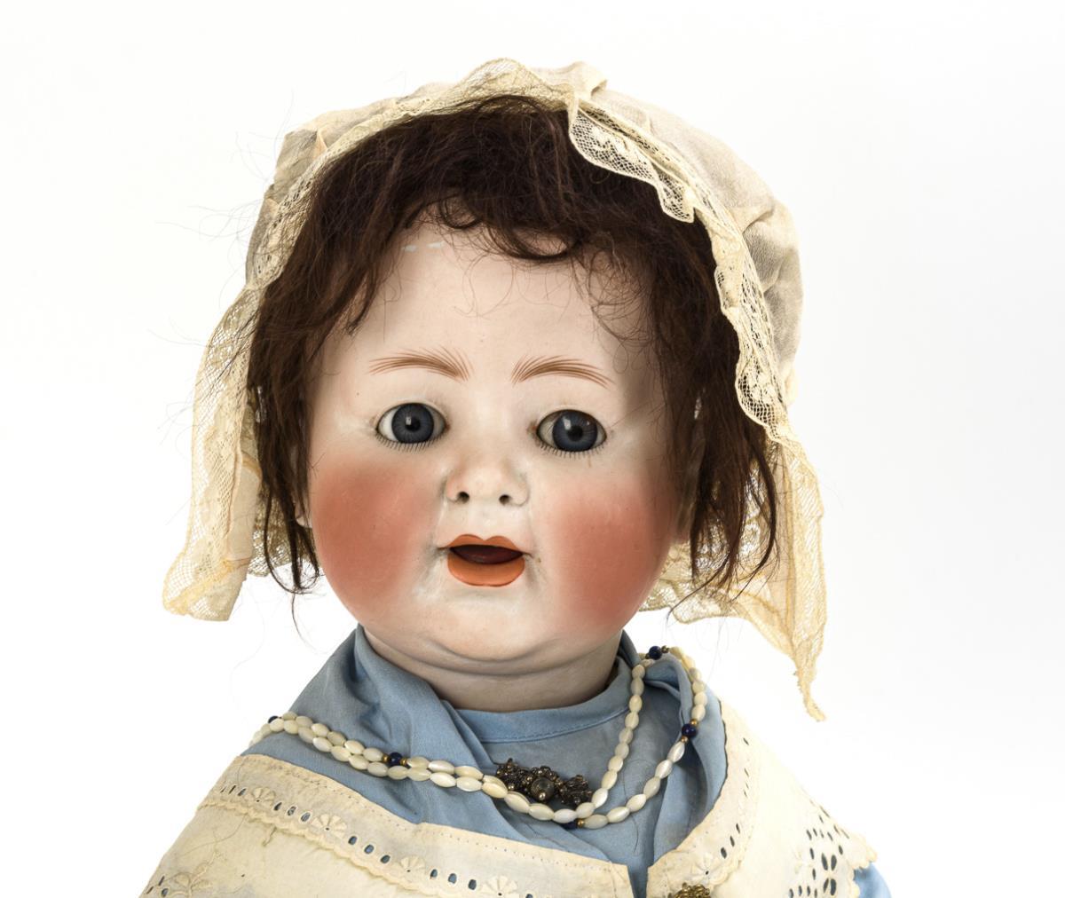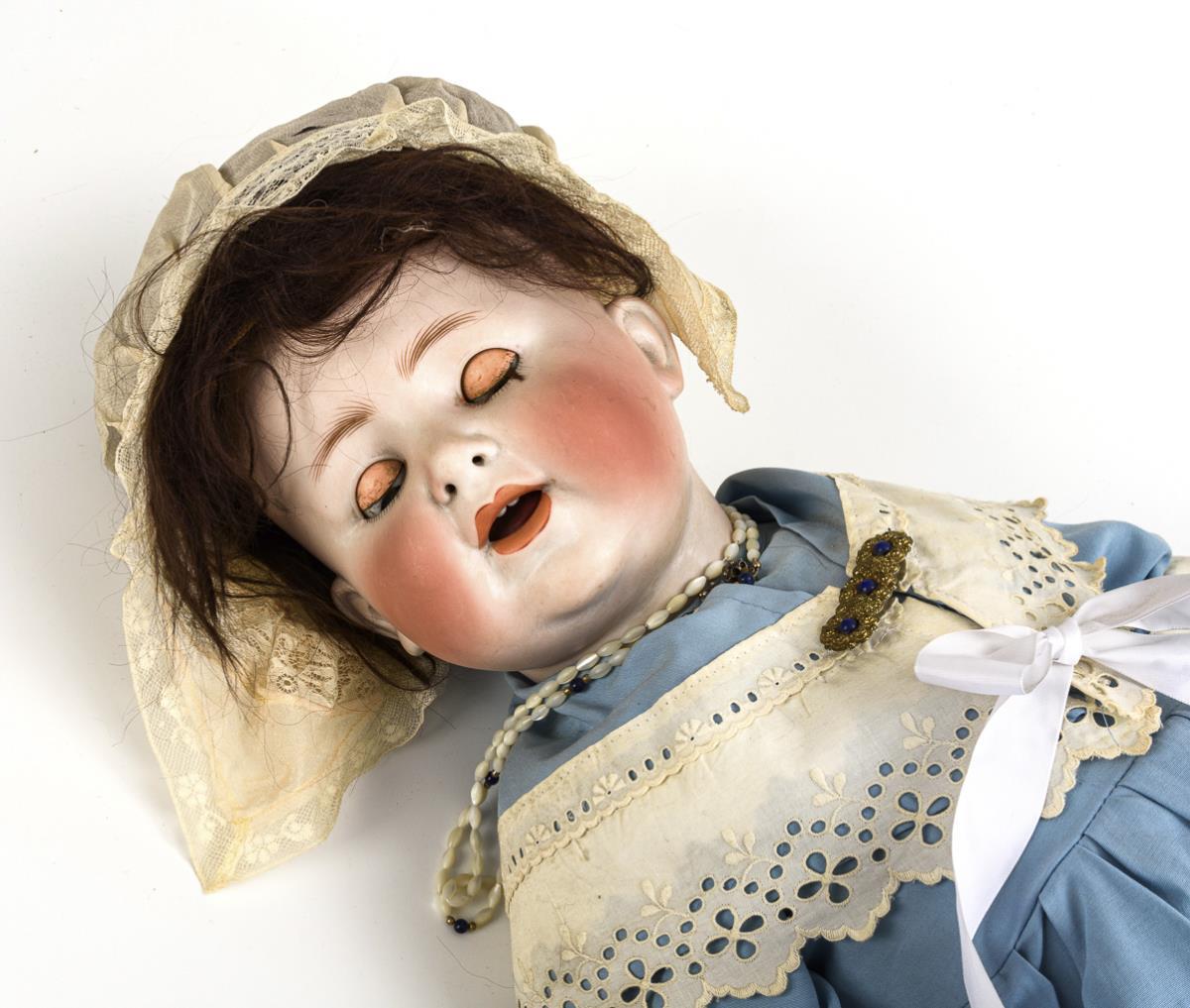 Kurbelkopf, blaue Schlafaugen, Wimpernreste, offene Nasenlöcher, Flatterzunge, braune Mohairperücke. 5-teiliger Sitzbabykörper. Blaues Kleid mit weißen Borten, helle Lederschuhe. Kopf durchleuchtet: ohne Defekte, minimaler Perückenpull an der Stirn. 1 Finger geklebt.