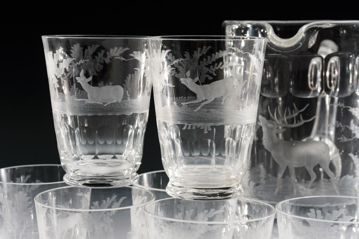 1 Krug (H 22 cm) und 10 Gläser mit der Darstellung von Rehen und Hirschen in einer Waldlandschaft, ausgekugelter Abriss.