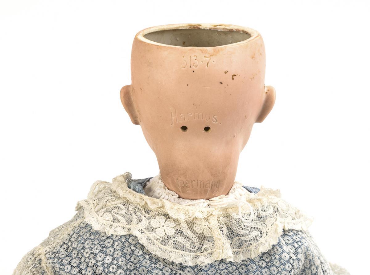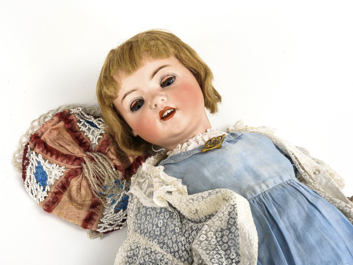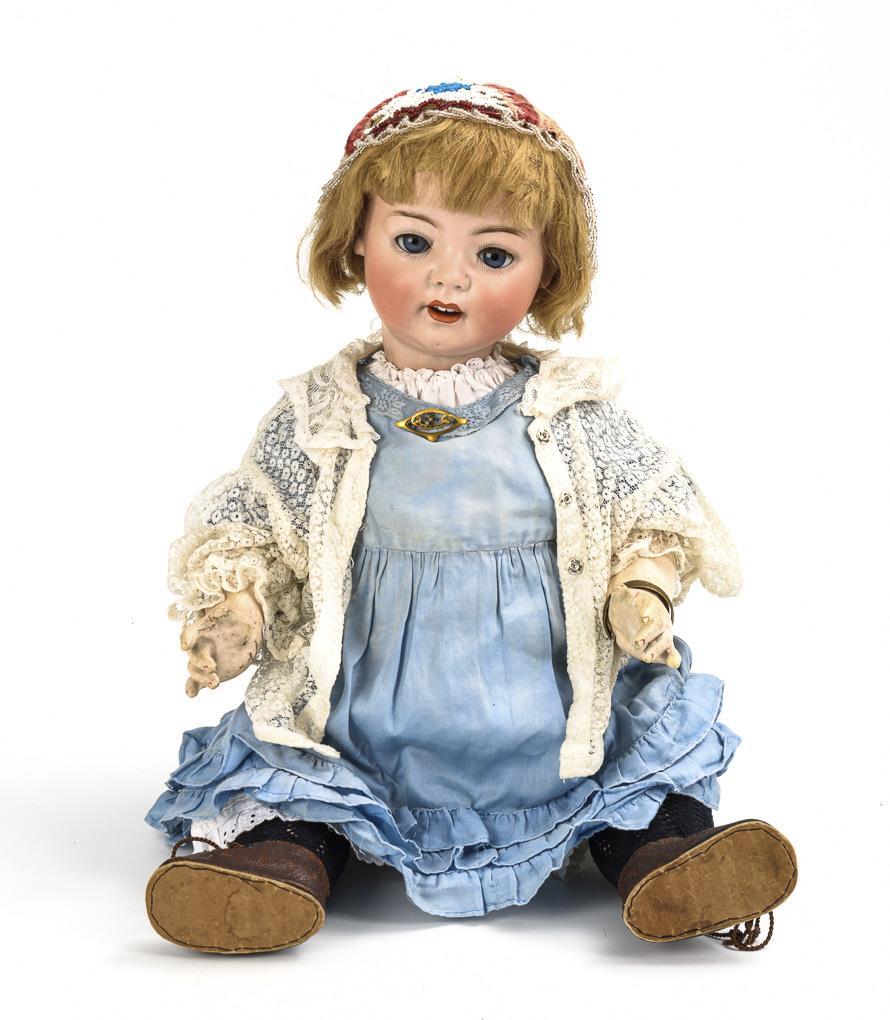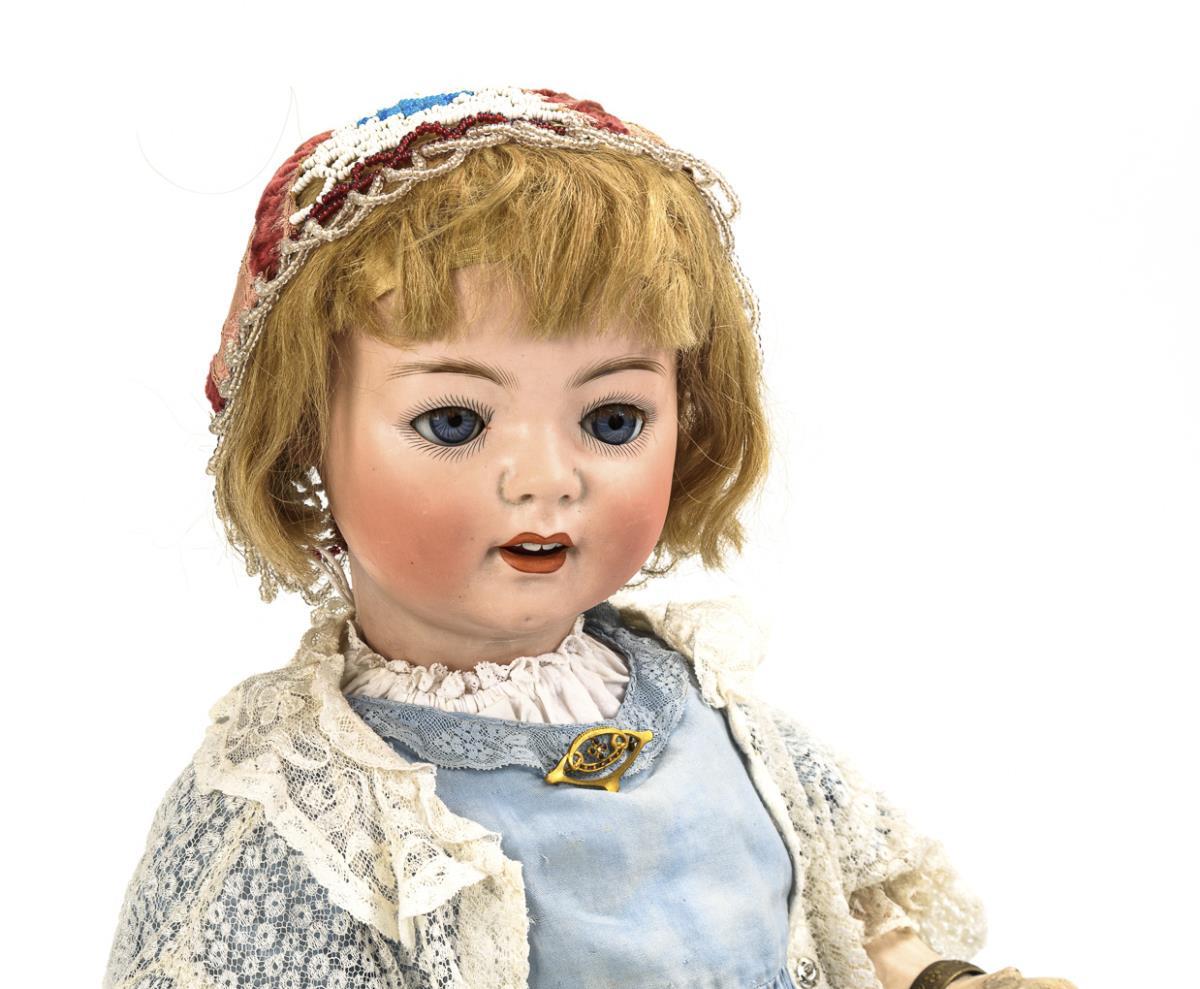 Kurbelkopf, blaue Schlafaugen, Wimpern, blonde Mohairperücke mit kleinen Kahlstellen. Einfacher, 5-teiliger Sitzbabykörper. Blaues Kleid, weißes Jäckchen, braune Lederschuhe, nachgenähte Perlenhaube. Kopf durchleuchtet: ohne Defekte, Schlafaugen nachgegipst.