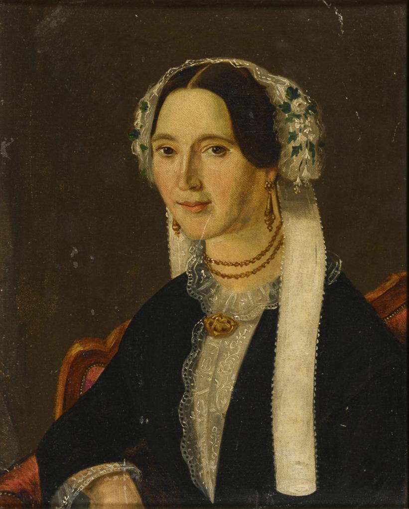Porträt der Caroline Mannigel mit weißer Spitzenhaube in einem Armlehnsessel. Altersspuren.