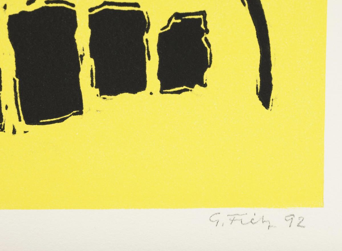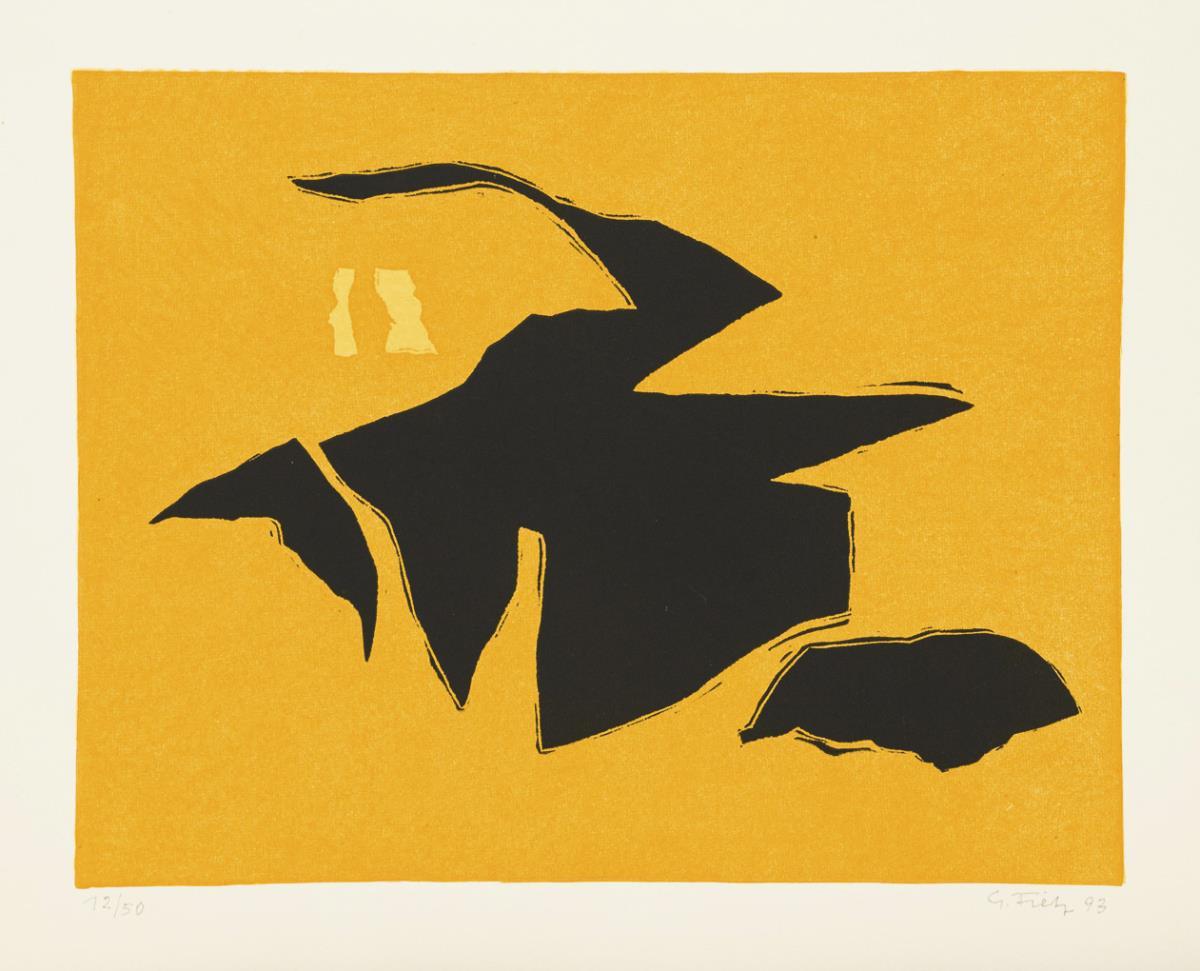 Abstrakte Komposition auf gelbem Grund: Druckstock: 34,5 x 40 cm, Exemplar: IX/X, 1992 für das Fritz Winter Haus | Abstrakte Komposition auf orangefarbenem Grund: Druckstock: 31,5 x 40 cm, Exemplar: 12/50, [19]93; beide Werke verso mit handschriftlicher Widmung.