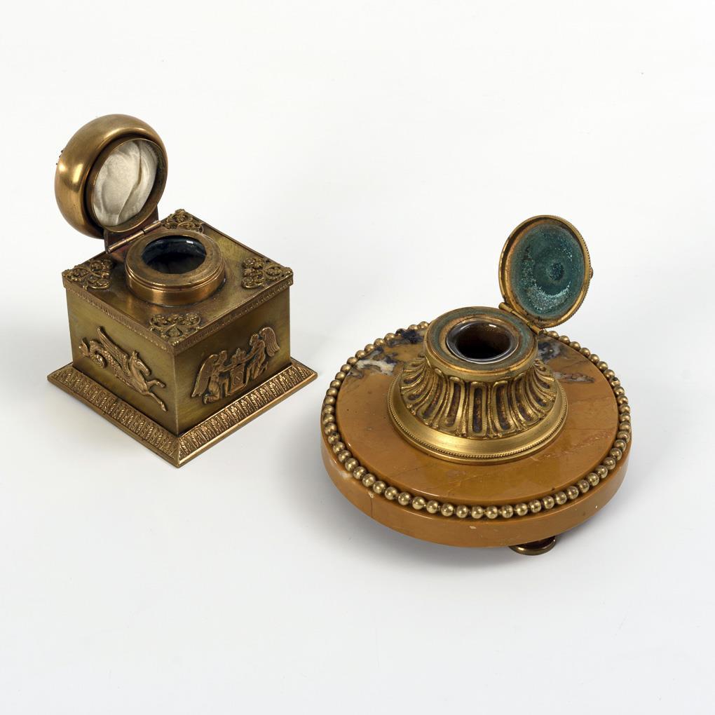 Facettiert geschliffene, schalenartige Glasvase mit feinen Friesen an der antikisierender Messing-Montierung. / Massiver Handleuchter mit Tragegriff und spätbarocker Reliefzier. / Würfelförmiges Tintenfass mit feinen Blattfriesen und Reliefappliken auf jeder Seite: 2x ein Engelspaar, die Kaiserkrone über dem Postament mit Napoleon-Monogramm haltend bzw. 2x ein Hippokamp. Auf dem Scharnierdeckel ein applizierter Eichen-Lorbeer-Kranz, darunter ein Glasnapf. / Tintenfass mit rundem Marmor-Sockel und verzierten Bronzegefäß mit Scharnierdeckel, darunter ein Glasnapf.