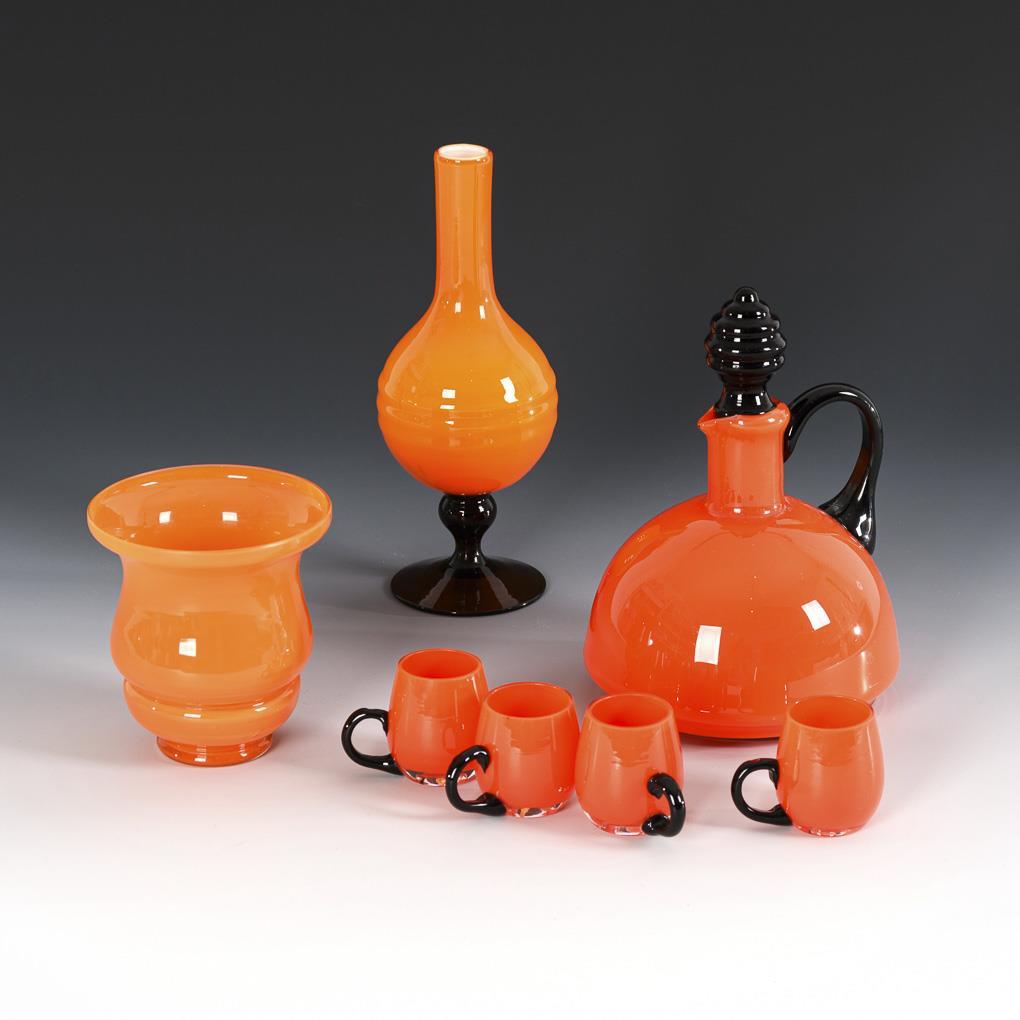 Orangefarbene Karaffe (H 17,5 cm) mit 4 Schnapsbechern (H 4,5 cm). / Orangefarbene Kratervase (H 10,5 cm). / Orangefarbene Enghalsvase mit Rundfuß (H 20 cm). 1 Schnapsbecher mit Randbestoßungen.