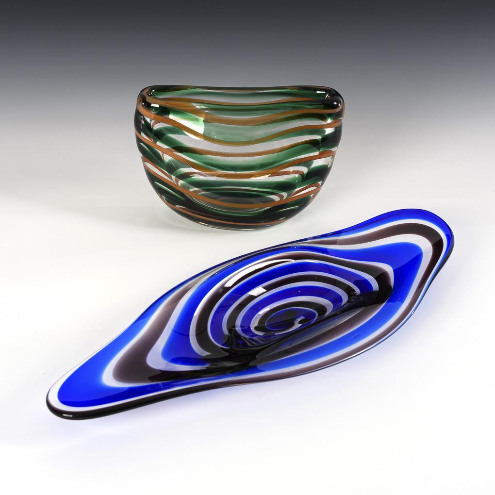 1x Vase "Unica": Plattvase aus farblosem Glas mit eingeschmolzenen opalbraunen und grünen Streifen (H 13,5 cm). / 1x Schale "Serica": spitzovale Schale aus farblosem Glas mit eingeschmolzenen kobaltblauen und braunen Streifen (L 40,5 cm).