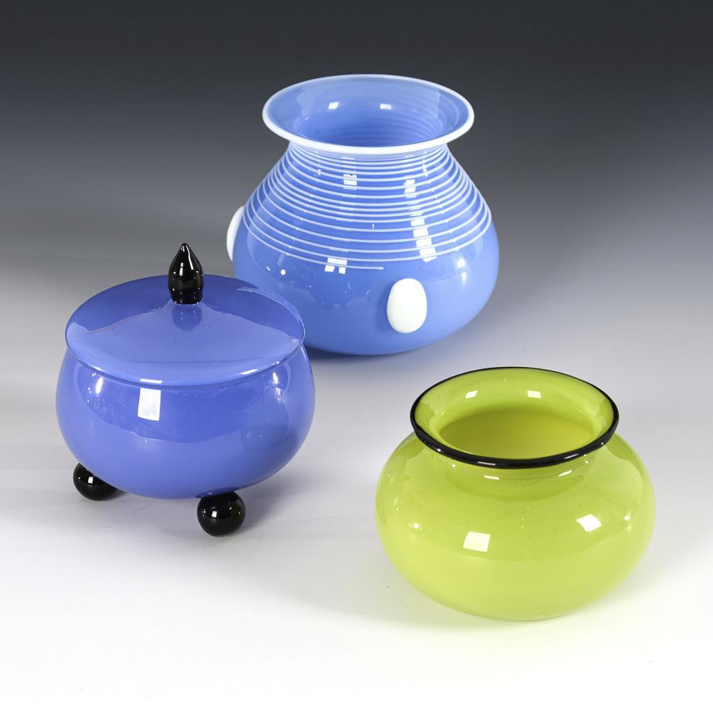 Tangoglas. Hellblaue bauchige Vase mit aufgeschmolzenem weißen Rand, weißem Spiralfaden auf der Wandung und drei aufgelegten Blättchen aus weißem Opalglas (H 10,5 cm). / Bauchige grüne Vase mit aufgeschmolzenem schwarzen Rand (H 7 cm). / Blaue Dose mit drei Kugelfüßen und Deckelknauf aus schwarzem Glas (H 11cm).