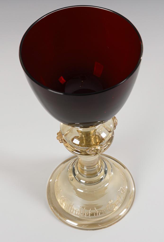 Farbloses Glas mit rubinrotem Innenfang an der Kuppa, teils lüstriert. H 25 cm.