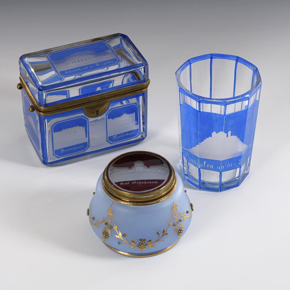 2x aus farblosem, blau gebeiztem Glas: rechteckige Dose mit metallmontiertem Scharnierdeckel und gravierten Teplitz-Ansichten (H 10,5 cm) und 1 facettierter Becher mit einer schauseitigen Ansicht (H 12 cm). / 1x Dose aus hellblauem Alabasterglas mit floraler Reliefgoldmalerei und aufgelegten Glasperlen, metallmontierter Scharnierdeckel mit einem eingesetzten farblosen, rot gebeizten Glas mit einer gravierten Ansicht von Bad Oeynhausen (H 7,5 cm). Einige Glasperlen der Dose fehlen.