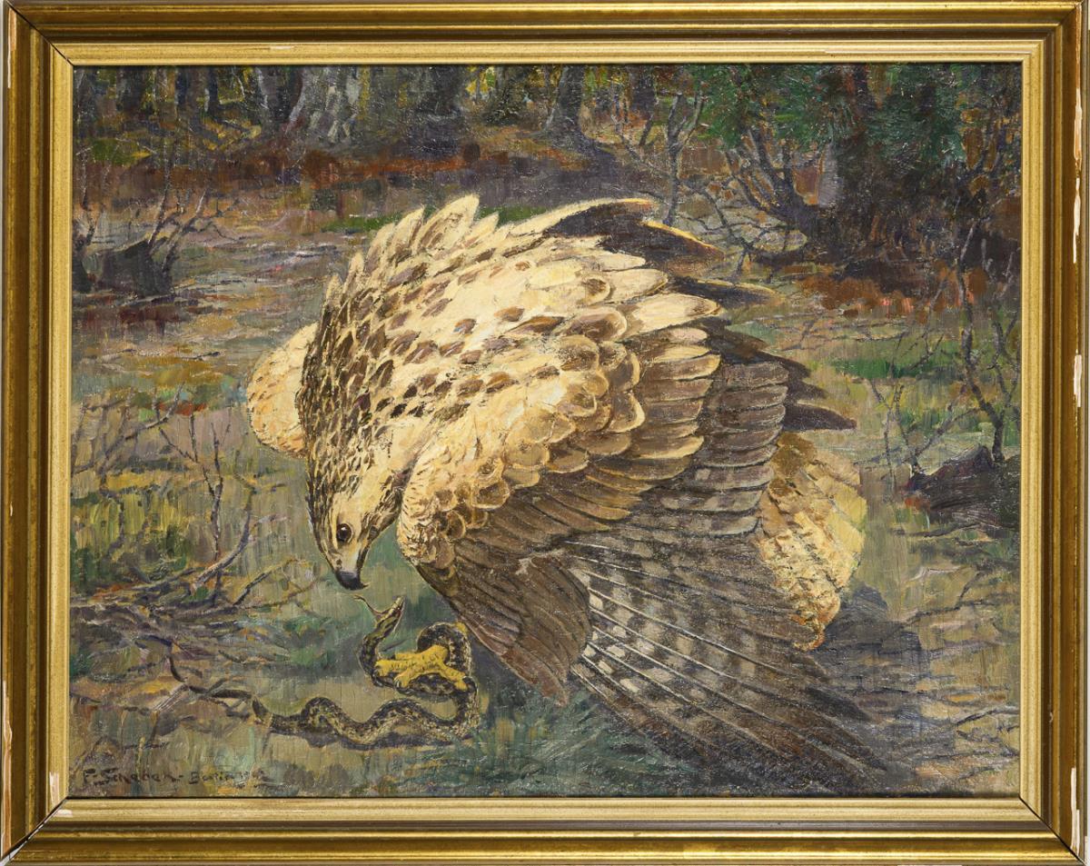Die Schlange im Schatten des Adlers, der sie in den Klauen am Boden hält. Altersspuren.