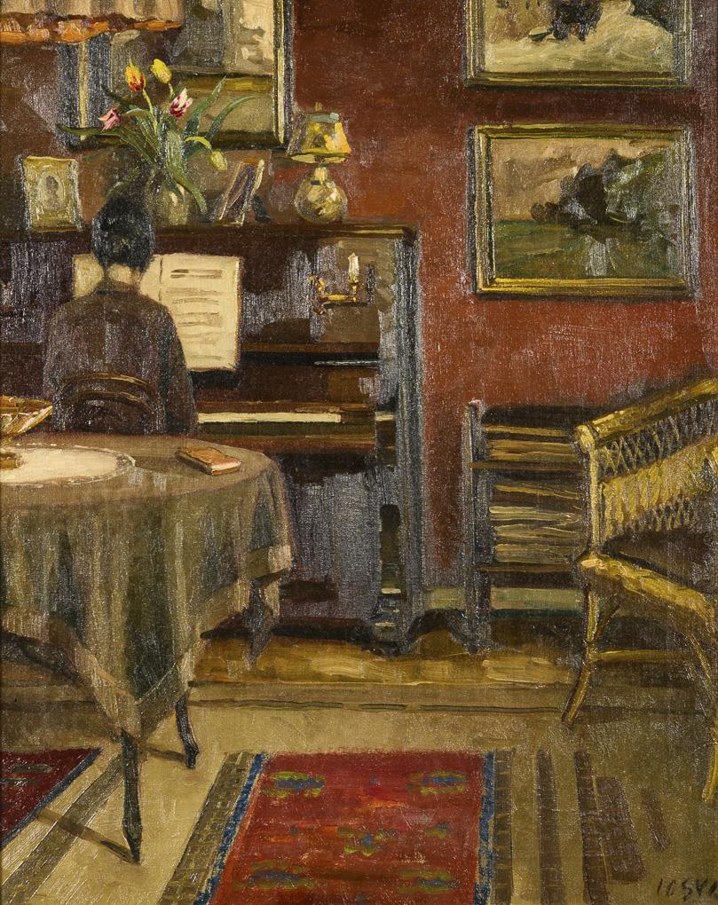 Junge Frau am Klavier in bürgerlichem Interieur mit Gemälden an den Wänden und hinter dem Sessel und dem Tisch.