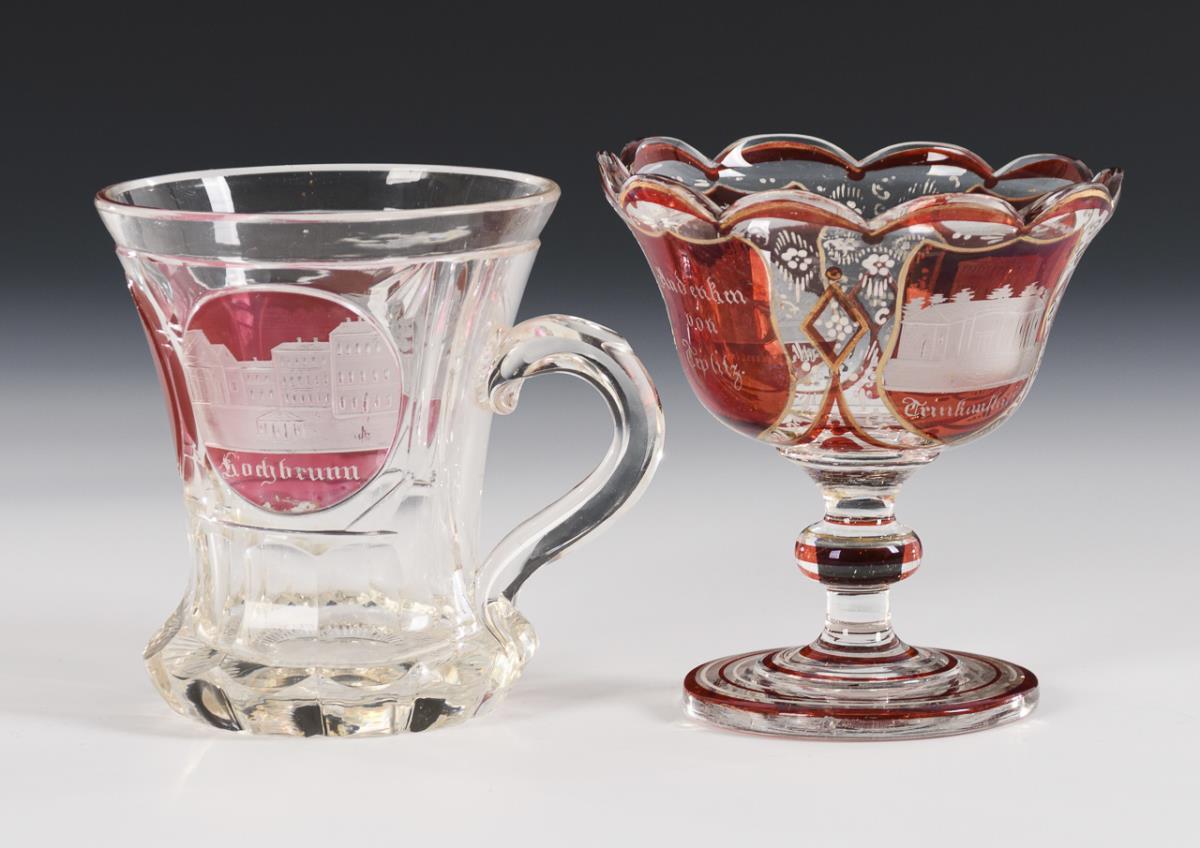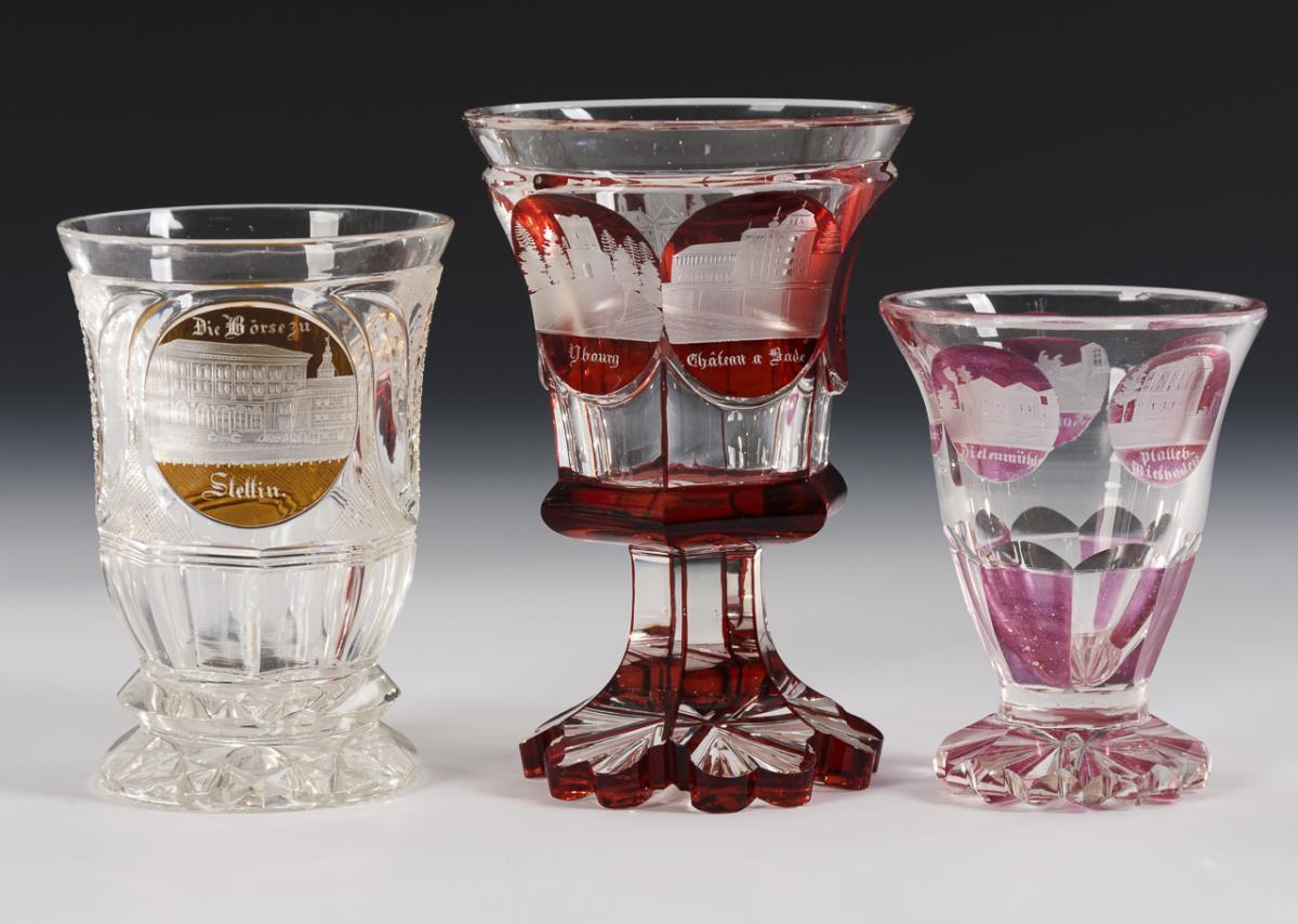 2 Kelchgläser und 1 Zuckerschale mit Rotbeize und bezeichneten Ansichten von u.a. Teplitz und Baden (H 2x 14 cm, 1x 11 cm). / 1 teils purpurfarben gebeizter Henkelbecher mit Wiesbaden-Ansichten (H 10,5 cm). / 1 teils violett gebeizter Kraterbecher mit Wiesbaden-Ansichten (H 10,5 cm). Je minimale Bestoßungen am Fuß oder Mündungsrand.