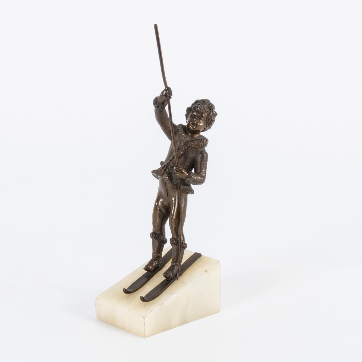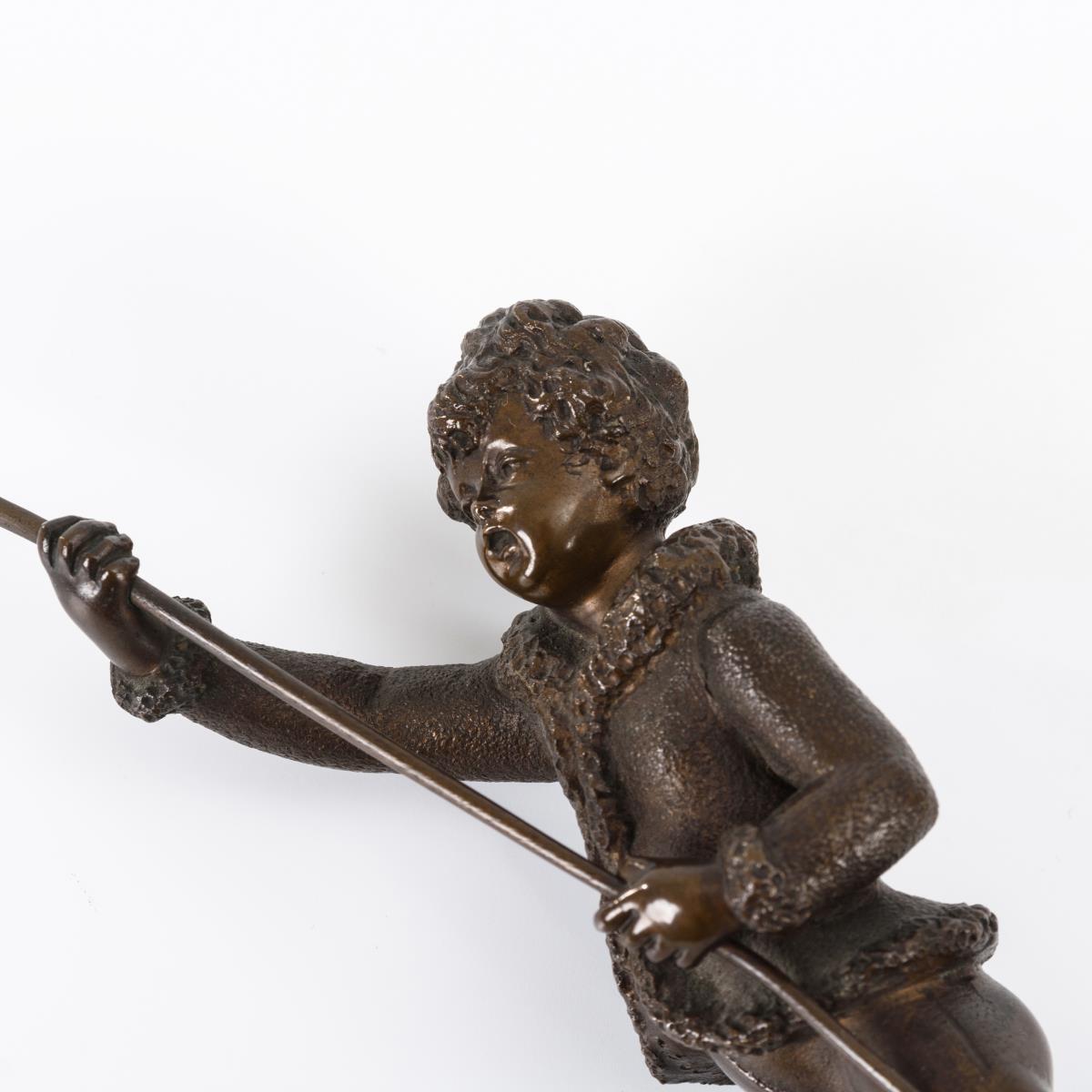 Bronze patiniert, Plinthe aus weißem Onyxmarmor. H 13,5 / 17 cm (je ohne Stab).