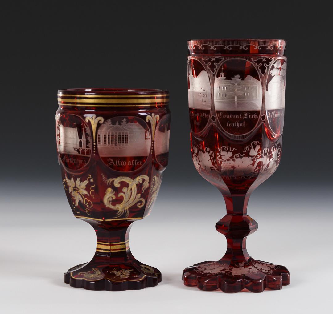 4 Kelchgläser und 1 Fußbecher mit gravierten Ansichten (u.a. Salzbrunn, Ballenstedt, Gernrode, Altwasser). 1x Rand beschliffen, 2x Bestoßung am Fußrand.