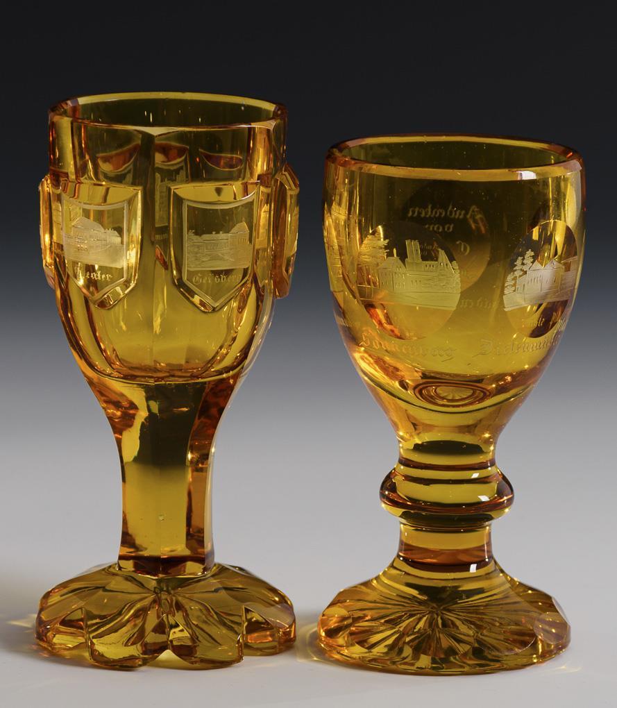 Farbloses, bernsteinfarben gebeiztes Glas. H 13,5 - 16,5 cm.
