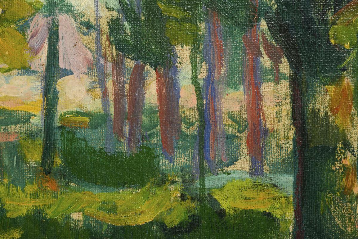 Heller Sonnenschein über den farbfreudig gemalten Bäumen. Minimal krakeliert.