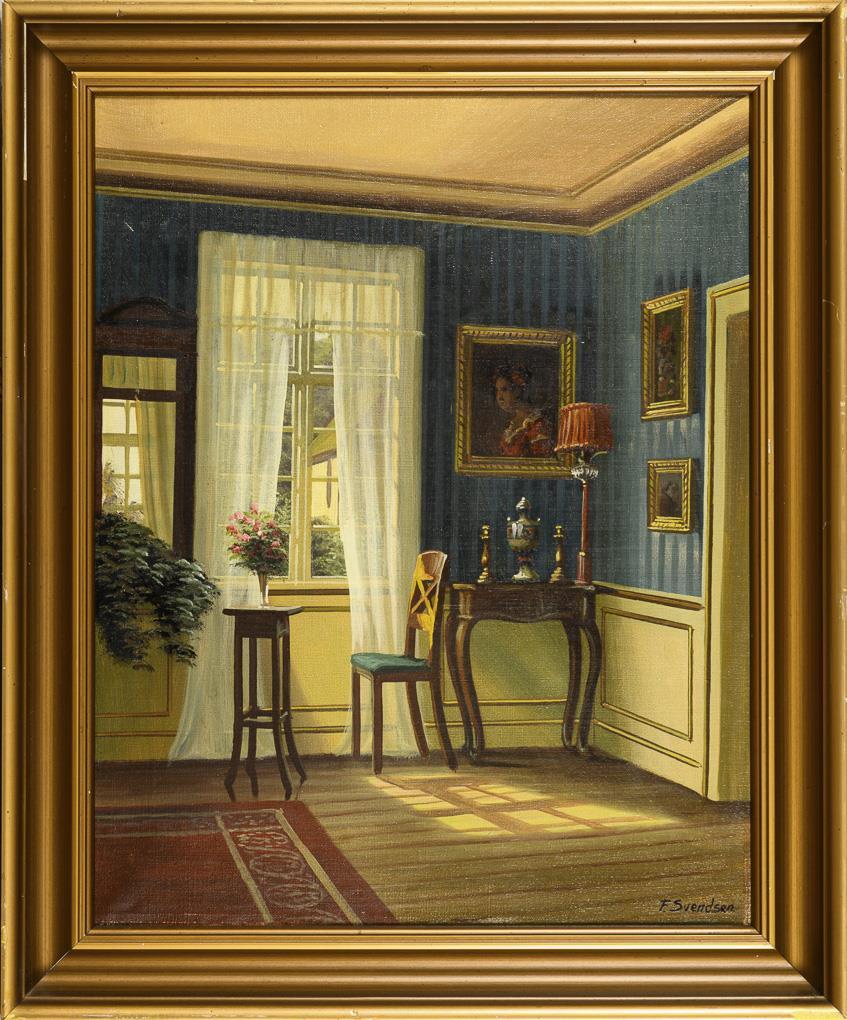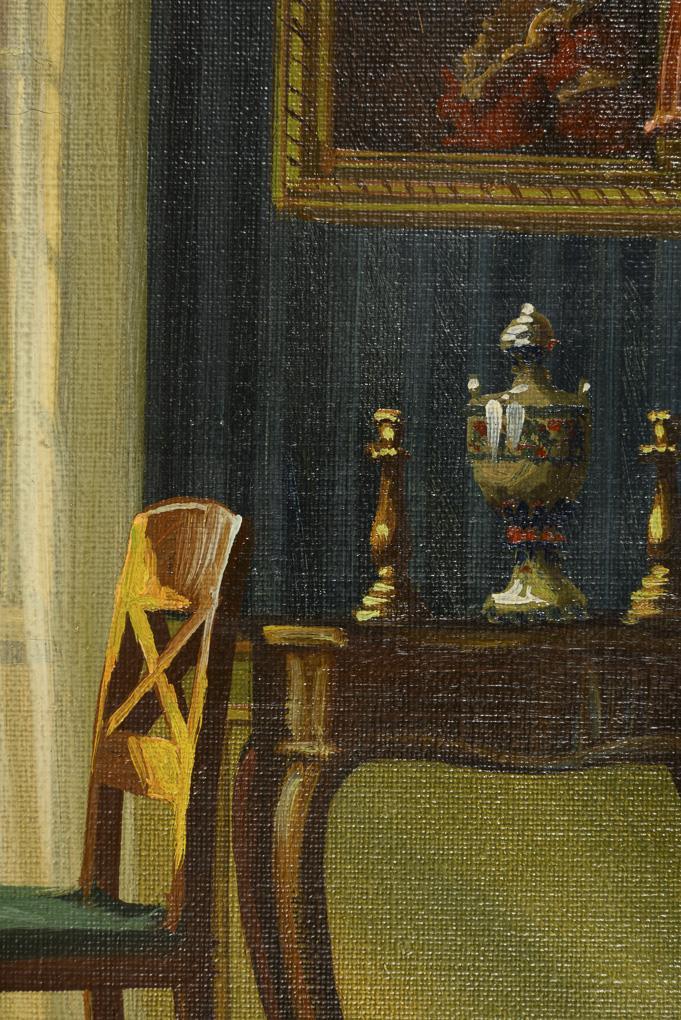Bürgerliche Stube mit gestreifter Tapete und schlichten Möbeln vor dem Fenster. Kleiner Kratzer.