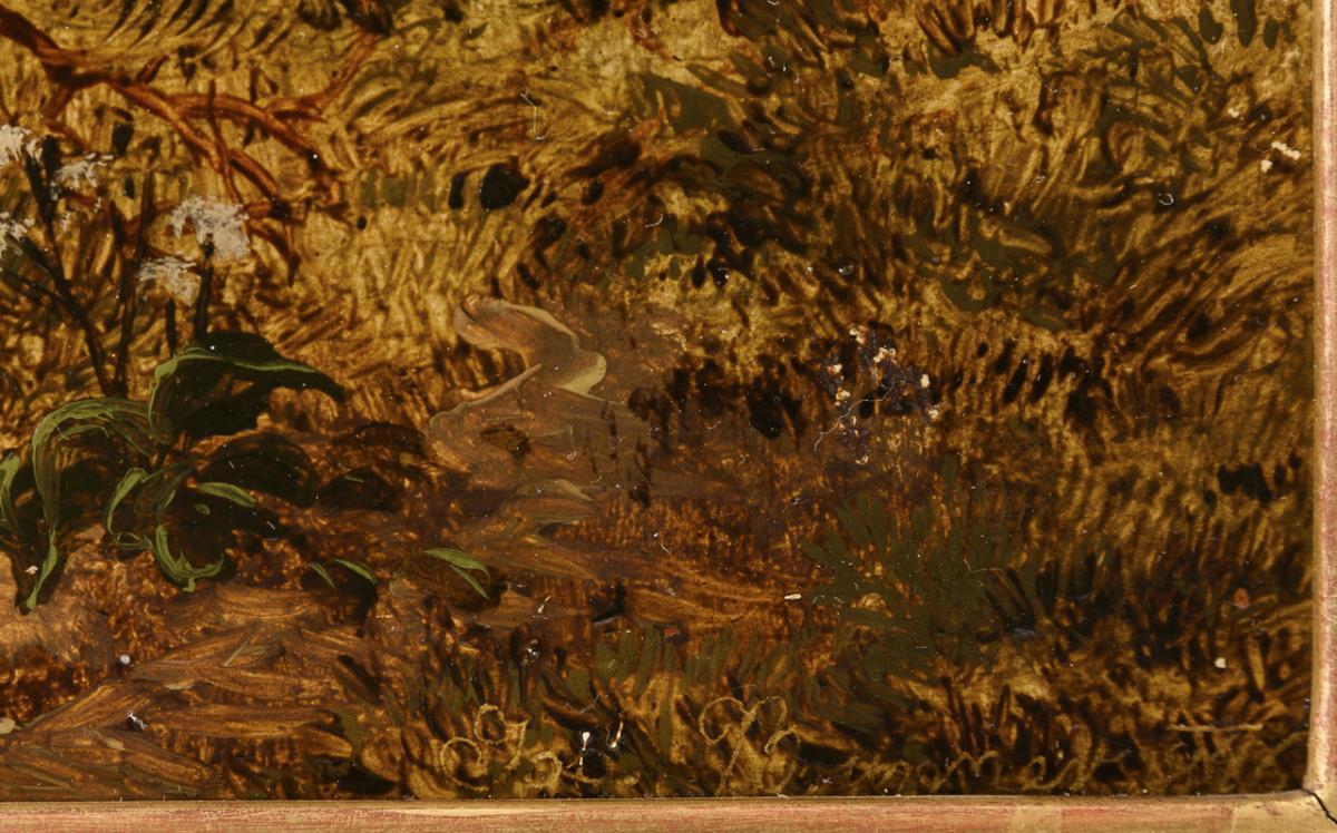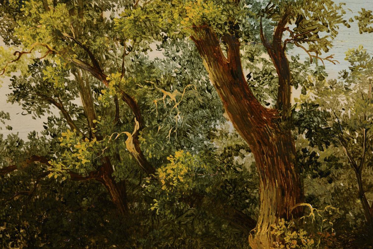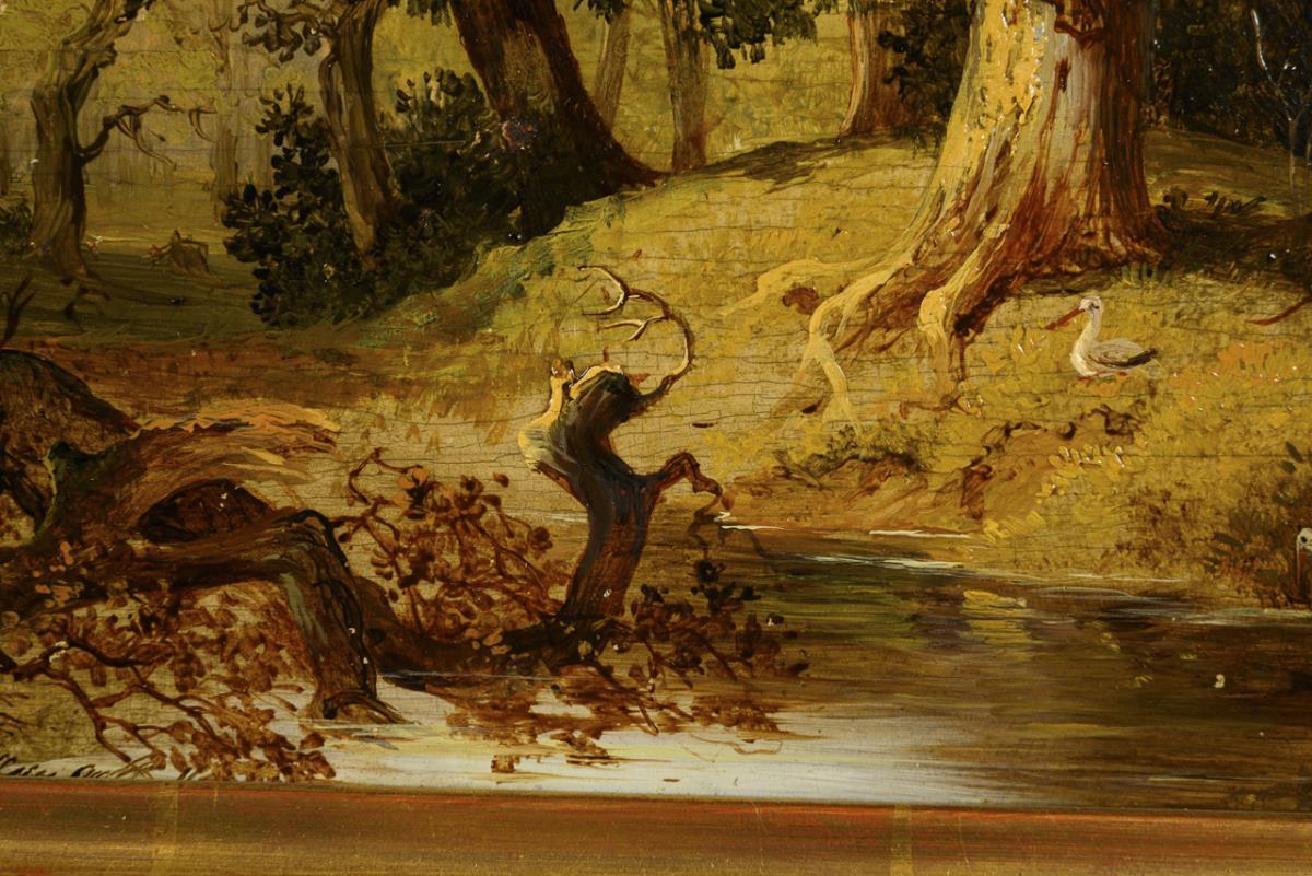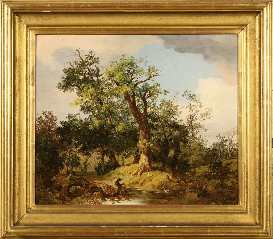 In der Art der Altmeister gemalte Landschaft mit Eichen an einem Bach im Sonnenschein. Leichte Altersspuren.