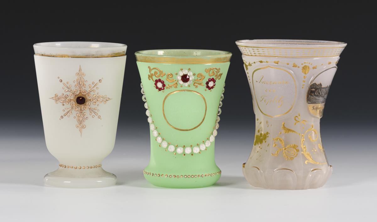 1x Josephinenhütte: Kelchglas aus weißem Alabasterglas mit Reliefgoldmalerei, einem roten Glascabochon sowie der schauseitig polychrom emailgemalten Ansicht vom Burgberg bei Harzburg. / 1x wohl Josephinenhütte: Kraterbecher aus hellgrünem Alabasterglas mit Reliefgoldmalerei, aufgelegten Glascabochons und der schauseitig gravierten und goldstaffierten Ansicht von Fürstenstein. / 1x facettierter Becher aus weißem Alabasterglas mit Reliefgoldmalerei und drei gravierten sowie gold- und silberstaffierten Ansichten von Teplitz. Gold berieben, 1x mit Randbestoßung.