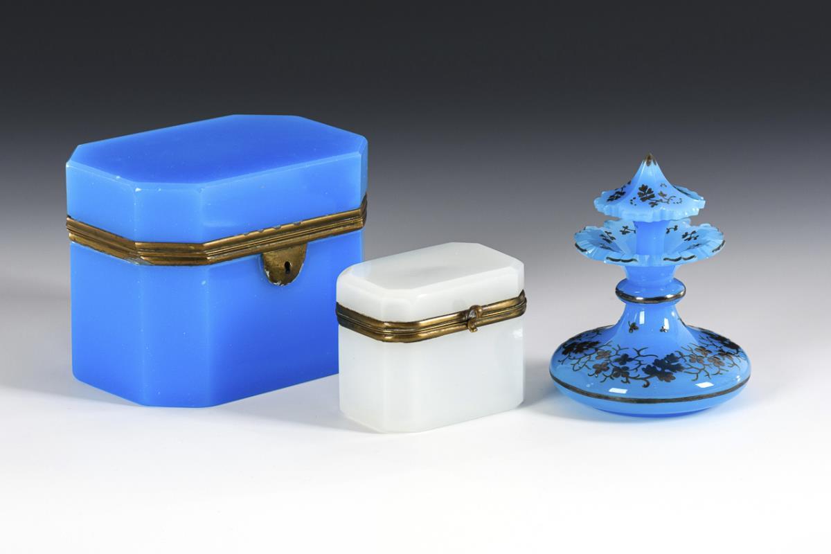 2 rechteckige Dosen aus weißem bzw. blauem Alabasterglas mit metallmontiertem Scharnierdeckel (H 6,5 und 10,5 cm). / 1 Flakon aus blauem Alabasterglas mit floraler Silbermalerei (H 11,5 cm). Blaue Dose mit kleinen Bestoßungen am Stand, Bestoßung am Rand des Flakons.