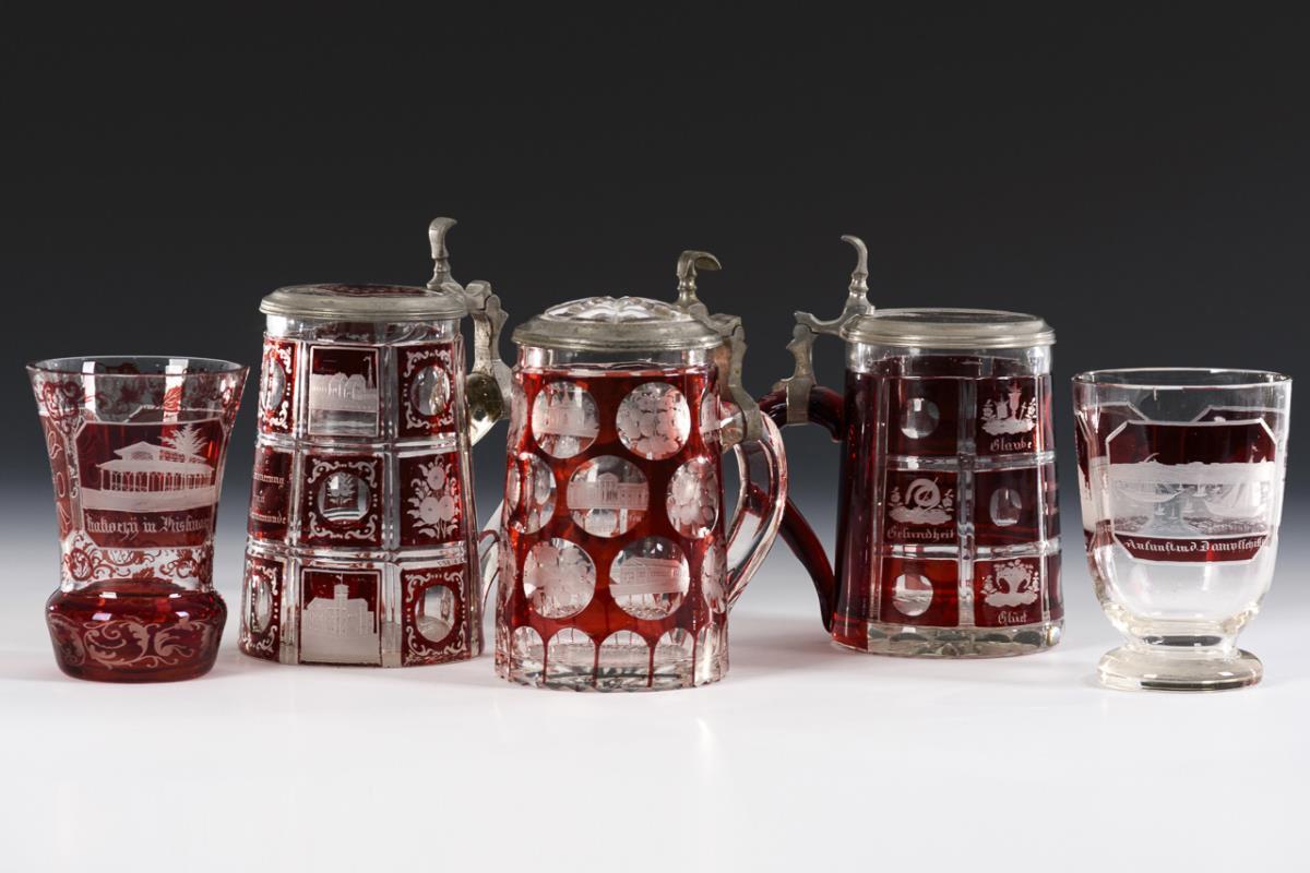 3 verschiedene konische Bierkrüge mit zinnmontiertem Scharnierdeckel mit Glaseinsatz (H 16-17cm). / 1 Fußbecher und 1 Kelchglas. 4x mit gravierten Ansichten (Bad Kissingen, Norderney, Warnemünde und Franzensbad), 1x mit dem Spruch Glaube / Hoffnung / u. Liebe / Gesundheit / Glück / u. Freude / Verlängere dein Leben" (H ca. 11,5 cm). 1x mit Kratzspuren, Mündungsrand des Fußbechers minimal bestoßen.