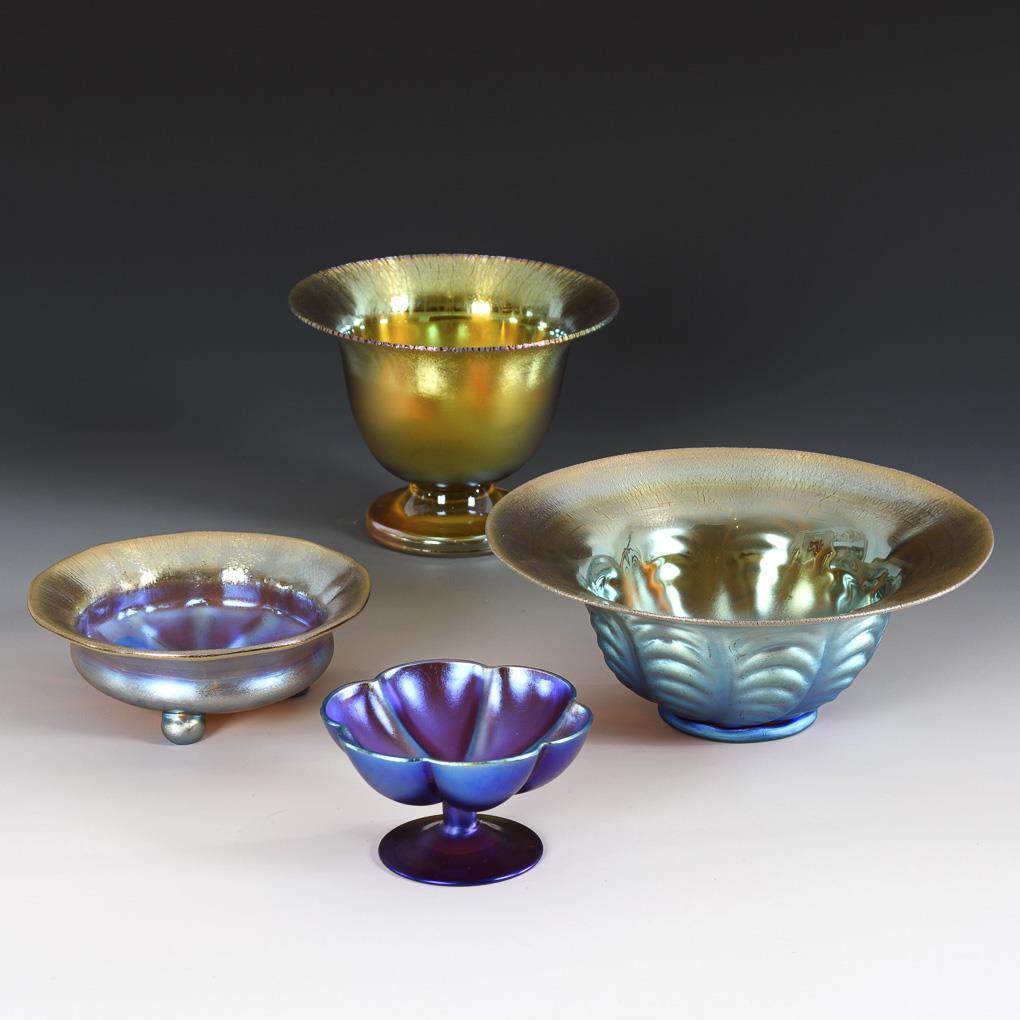 Gefußte Kraterschale (H 11 cm). / Schale mit rippenoptisch geblasener Wandung (H 8 cm). / Längsoptisch geblasene, kleine Schale mit drei Kugelfüßen (H 5 cm). / Sechspassige Fußschale (H 6 cm). Minimale Bestoßungen am Rand des Fußschälchens.