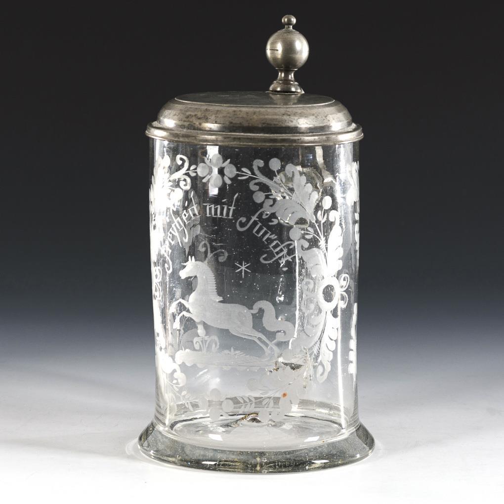 Walzenkrug mit Bandhenkel und zinnmontiertem Scharnierdeckel; Abriss. Auf der Wandung das gravierte Motiv eines springenden Pferdes unter der Losung "freyheit mit furcht", gerahmt von Blütenzweigen.