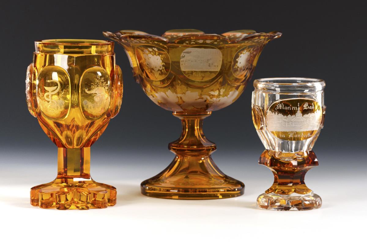 1x facettierte Kraterschale mit facettiertem Schaft und Rundfuß und gravierten Ansichten von Bad Kösen (H 16,5 cm). / 1x facettiertes Kelchglas mit der gravierten Ansicht von Marienbad (H 12,5 cm). / 1x facettierter Freundschaftsbecher mit gravierten Symbolarrangements (H 16 cm). Partiell bestoßen.