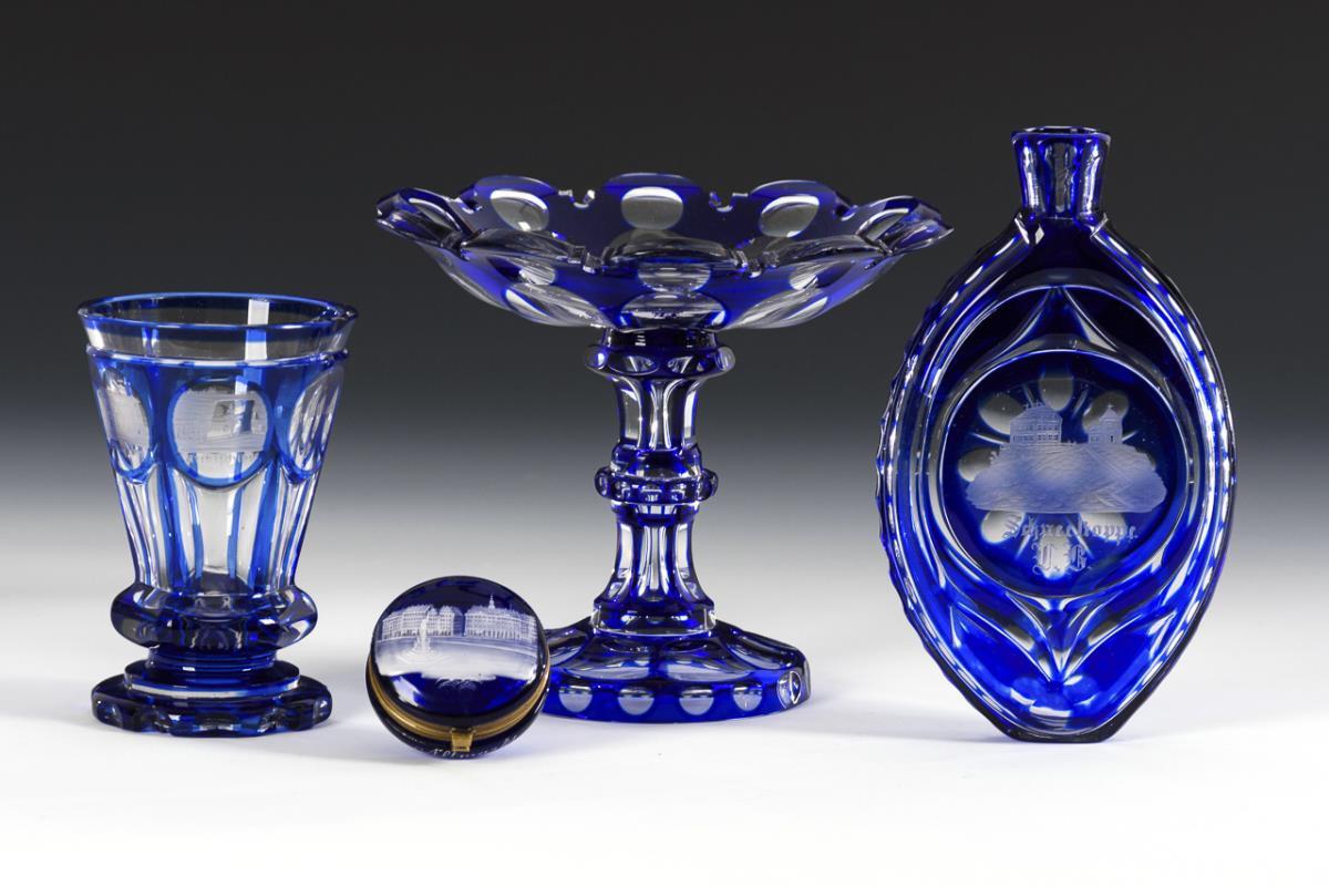 Tafelaufsatz mit mehrpassiger Schale, facettiertem Schaft und Rundfuß (H 14,5 cm). / Plattflasche mit der gravierten Ansicht der Schneekoppe (L 17,5 cm). / Fußbecher mit gravierten Ansichten der Sächsischen Schweiz (H 12,5 cm). / Döschen mit metallmontiertem Scharnierdeckel und einer schneegemalten Ansicht des Altmarktes in Dresden (Ø 5,5 cm). Bestoßung am Becherrand.