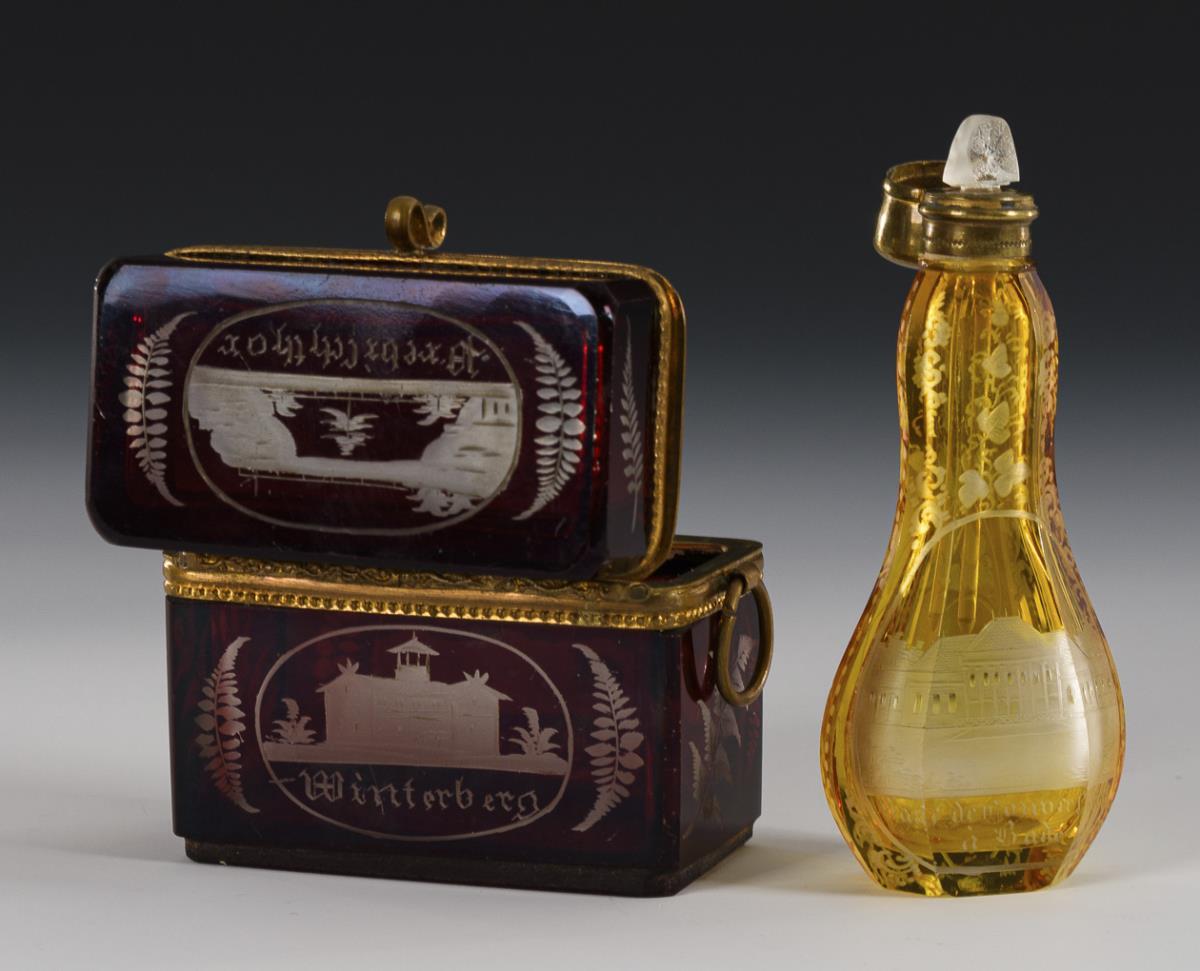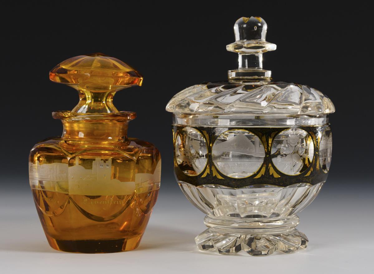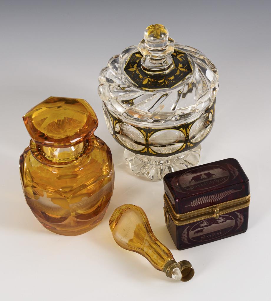 1x Dose aus farblosem, teils gelb gebeiztem Glas mit Facetten- und Linsenschliff sowie gravierten Rheinansichten (H 15,5 cm). / 1x sechsfach facettierter Flakon aus farblosem, gelb gebeiztem Glas mit gravierten Rheinansichten (H 13 cm). / 1x kleine rechteckige Dose aus farblosem, rot gebeiztem Glas mit Ansichten der Sächsischen Schweiz (H 6,5 cm). / 1x kleiner Flakon aus farblosem, gelb gebeiztem Glas mit Baden-Ansicht (L 10 cm). Innenrand des Dosendeckels mit kleinen Bestoßungen, beschliffene Bestoßung am Rand eines Flakons, Metallmontierung am Fuß der Dose fehlt.