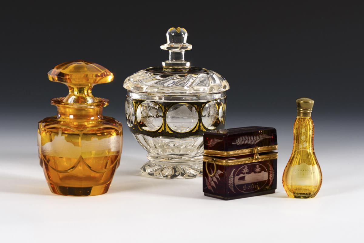 1x Dose aus farblosem, teils gelb gebeiztem Glas mit Facetten- und Linsenschliff sowie gravierten Rheinansichten (H 15,5 cm). / 1x sechsfach facettierter Flakon aus farblosem, gelb gebeiztem Glas mit gravierten Rheinansichten (H 13 cm). / 1x kleine rechteckige Dose aus farblosem, rot gebeiztem Glas mit Ansichten der Sächsischen Schweiz (H 6,5 cm). / 1x kleiner Flakon aus farblosem, gelb gebeiztem Glas mit Baden-Ansicht (L 10 cm). Innenrand des Dosendeckels mit kleinen Bestoßungen, beschliffene Bestoßung am Rand eines Flakons, Metallmontierung am Fuß der Dose fehlt.