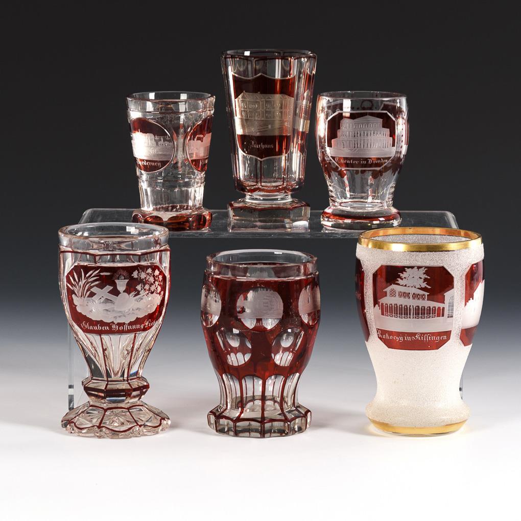 5x mit gravierten Ansichten (u.a. Bad Kissingen, Norderney, Elbsandsteingebirge, Dresden). / 1x mit dem Symbolarrangement "Glauben, Hoffnung, Liebe". Partiell minimale Bestoßungen an Mündungs- und Fußrand.