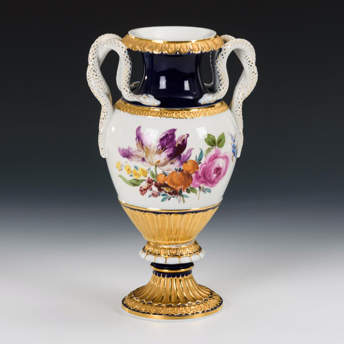 Kobaltblauer Teilfond, polychrome Blumenmalerei, teils bronzierte Goldstaffage. H 27 cm.