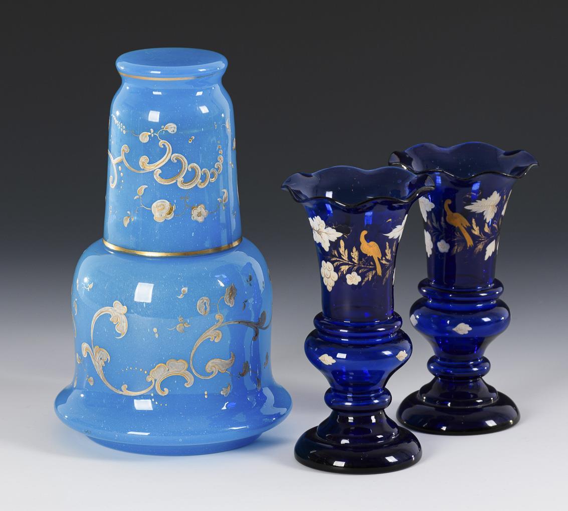 2x Vasen aus kobaltblauem Glas mit Vogel- und Weinrebenmalerei (H 16 cm). / 1x Karaffe (H 20 cm) mit Stopfen und Becher (H 11 cm) aus hellblauem Alabasterglas mit vegetabiler Goldmalerei. Partiell minimaler Goldabrieb.