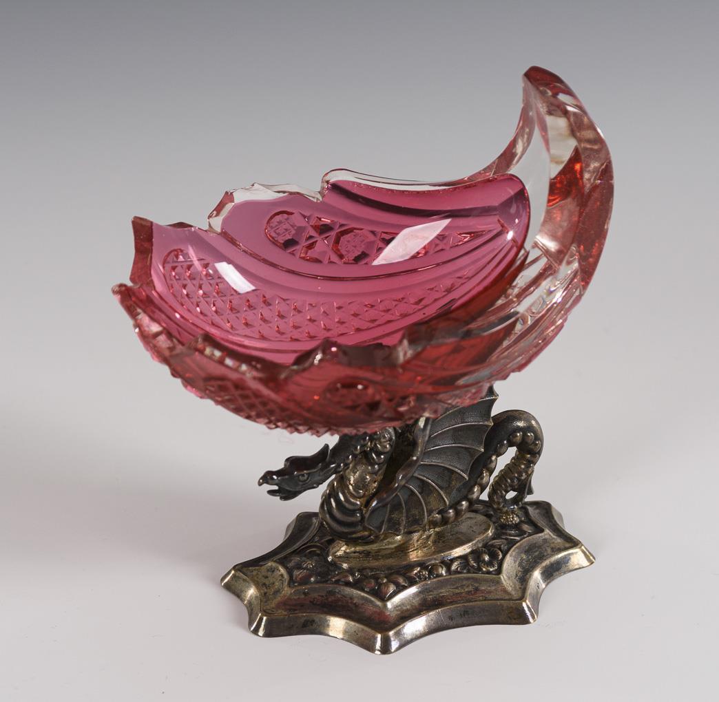1x Schale mit mehrpassigem Rand, Steinel- und Kerbschliffdekor sowie Delfinfuß aus Metall (H 18,5 cm). / 1x Muschelschale mit Kerb- und Steinelschliffdekor sowie Drachenfuß aus Metall (H 10,5 cm). Rand des Muschelschälchens bestoßen.
