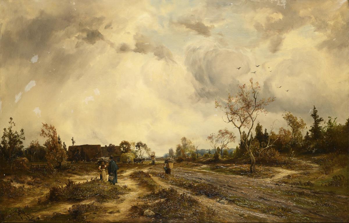 Reisigsammlerinnen auf der Straße nahe dem Dorf mit dem Heuwagen in weiter, herbstlicher Landschaft. Altersspuren.