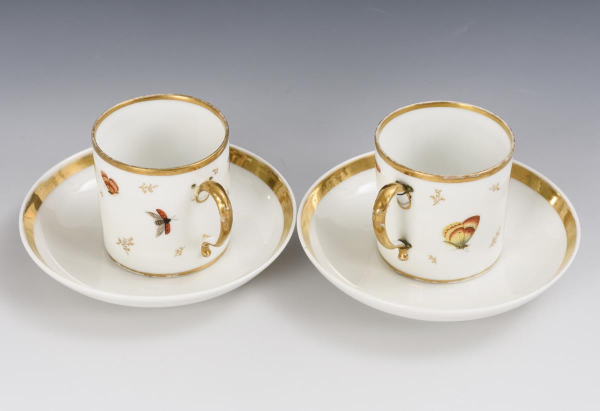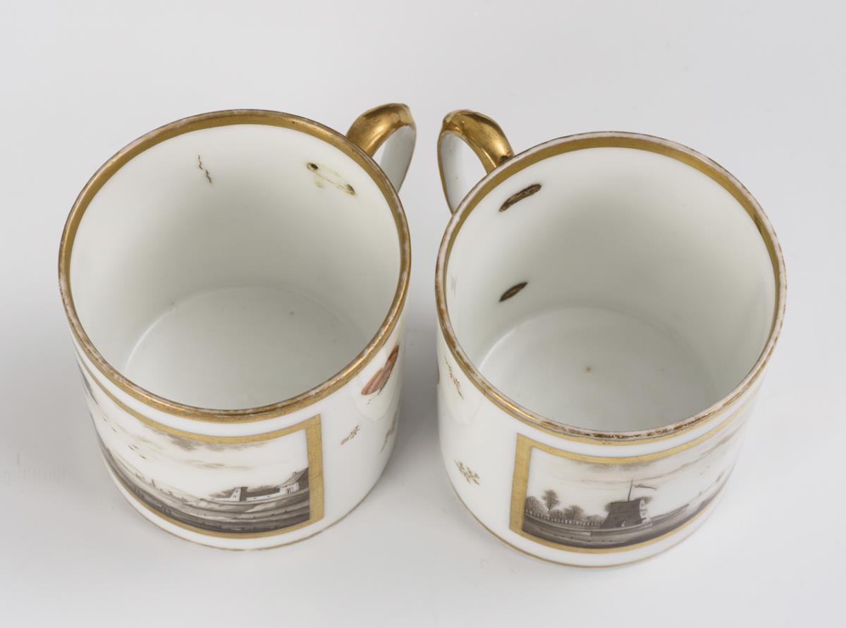 Zylindertassen mit Ohrenhenkel. Schauseitig eine goldgerahmte Rechteckkartusche mit der schwarzlotgemalten Darstellung einer Küste mit Turm und Segelschiffen bzw. einer Flusslandschaft mit Angler, verso Insekten und kleine Goldzweige. Partieller Goldabrieb, Henkel alt repariert bzw. geklebt.